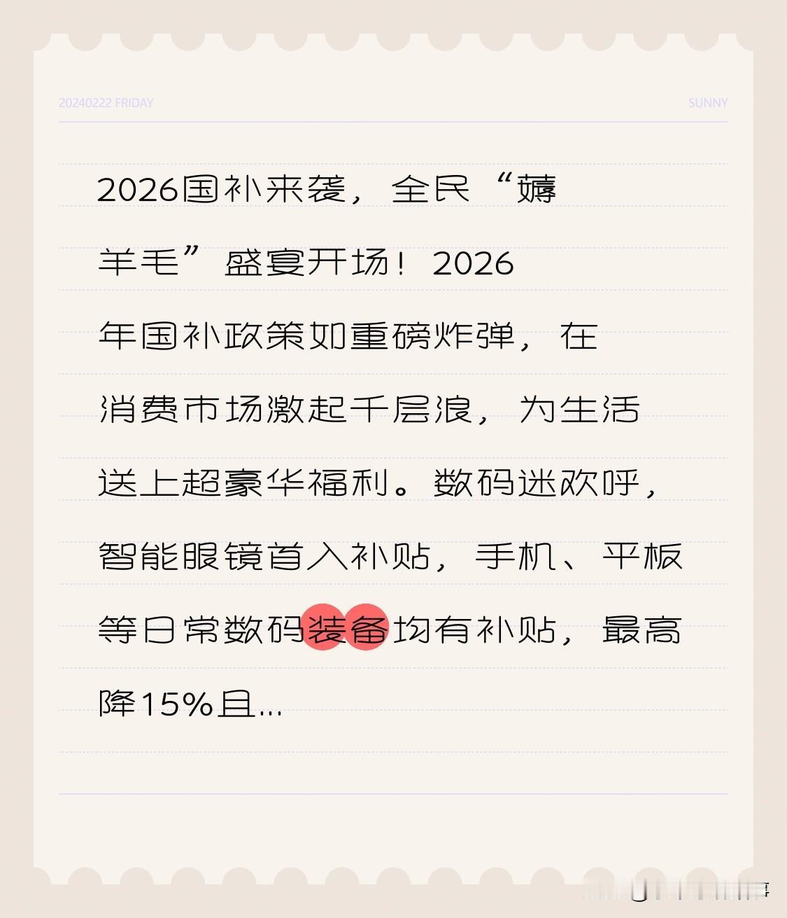 2026国补来袭,全民“薅羊毛”盛宴开场! 2026年国补政策如重磅炸弹,在消费市场激起千层浪,为生活送上超豪华福利。 数码迷欢呼,智能眼镜首入补贴,手机、平板等日常数码装备均有补贴,最高降15%且优惠可叠加,心仪装备唾手可得。 家电控也有惊喜,6类家电补贴高至1500元,旧家电可换新,品质生活更实惠。 汽车爱好者的春天到了,国补细则让购车成本大降,轻松圆汽车梦。 国家发改委严打骗补,大家要守规则。 别等了,快行动,评论区晒清单,看谁是“薅羊毛”高手!
