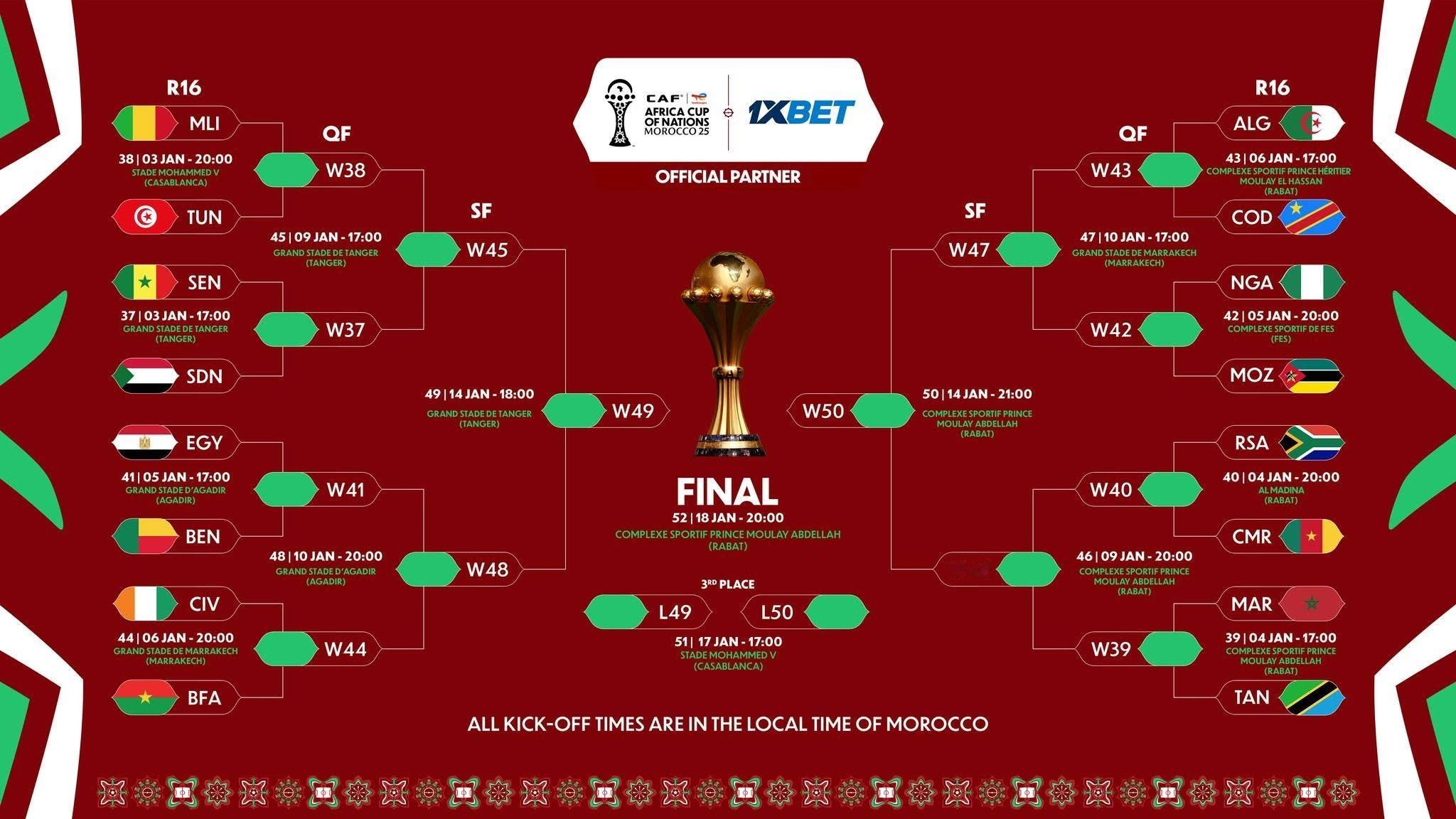 分組賽終極積分榜:安哥拉最終都係搭唔到尾班車,四個最佳分組第三分別係- 坦桑尼亞、比寧、蘇丹以及莫桑比克。十六強對陣形勢隨之出爐,實力較接近嘅對壘會有馬里🆚突尼西亞、南非🆚喀麥隆、阿爾及利亞🆚民主剛果以及科特迪瓦🆚布基納法索。至於晉級路線走勢佈局都幾平均,相信進入1/4決賽後嘅情況會相當白熱化!1/8決賽對賽形勢-上半區:馬里🇲🇱🆚🇹🇳突尼西亞、塞內加爾🇸🇳🆚🇸🇩蘇丹、埃及🇪🇬🆚🇧🇯比寧、科特迪瓦🇨🇮🆚🇧🇫布基納法索;下半區:阿爾及利亞🇩🇿🆚🇨🇩民主剛果、尼日利亞🇳🇬🆚🇲🇿莫桑比克、南非🇿🇦🆚🇨🇲喀麥隆、摩洛哥🇲🇦🆚🇹🇿坦桑尼亞。 🌍⚽️🏆🇲🇦
