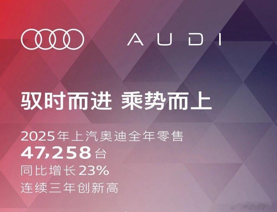 你好2026上汽奥迪2025年销量超4.7万辆。同比增长23%。2025年,上汽奥迪A5L Sportback与奥迪 E5 Sportback上市,拉动了销量增长。2026年,奥迪 E7X将上市,进一步拉动销量增长。