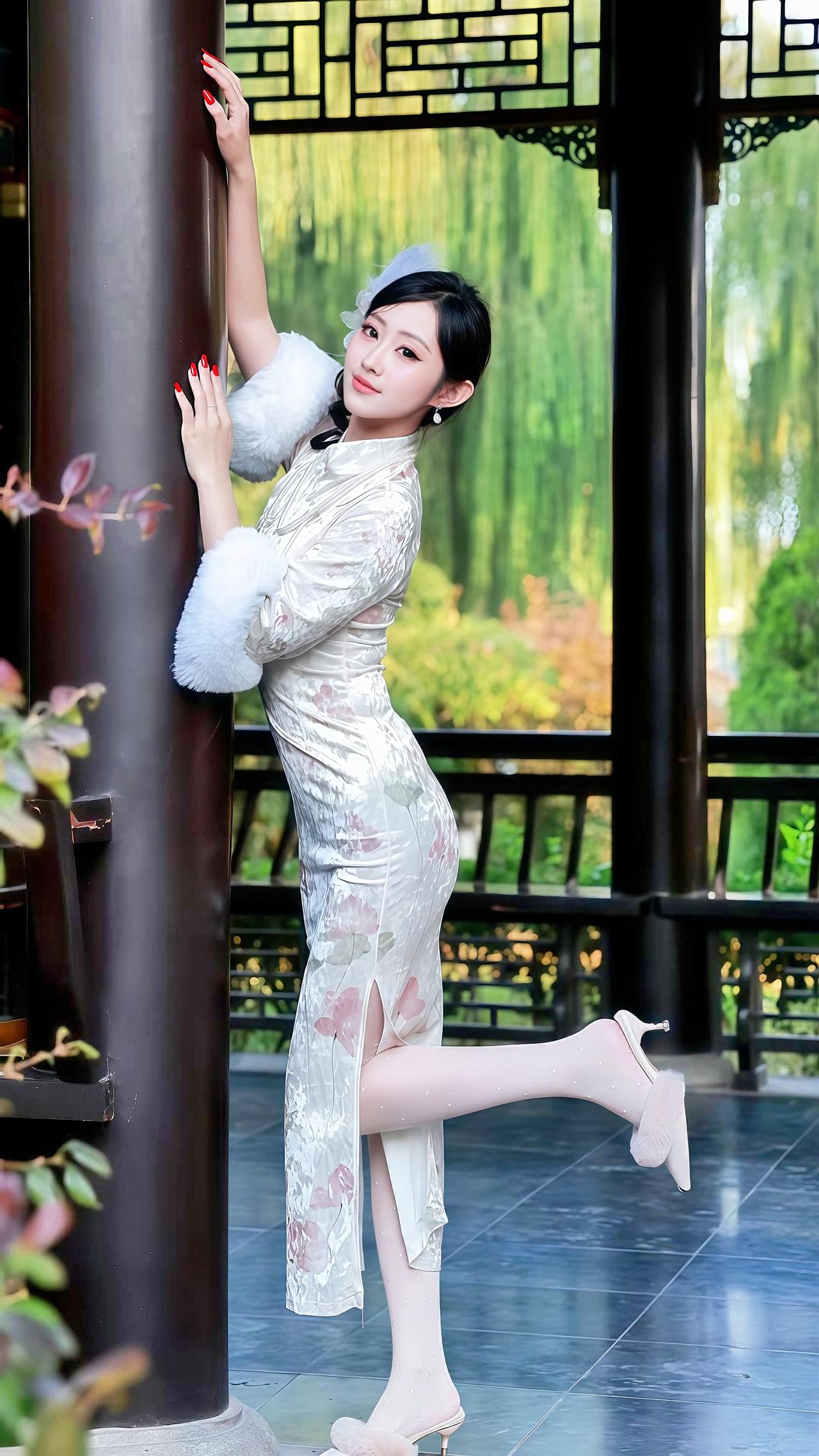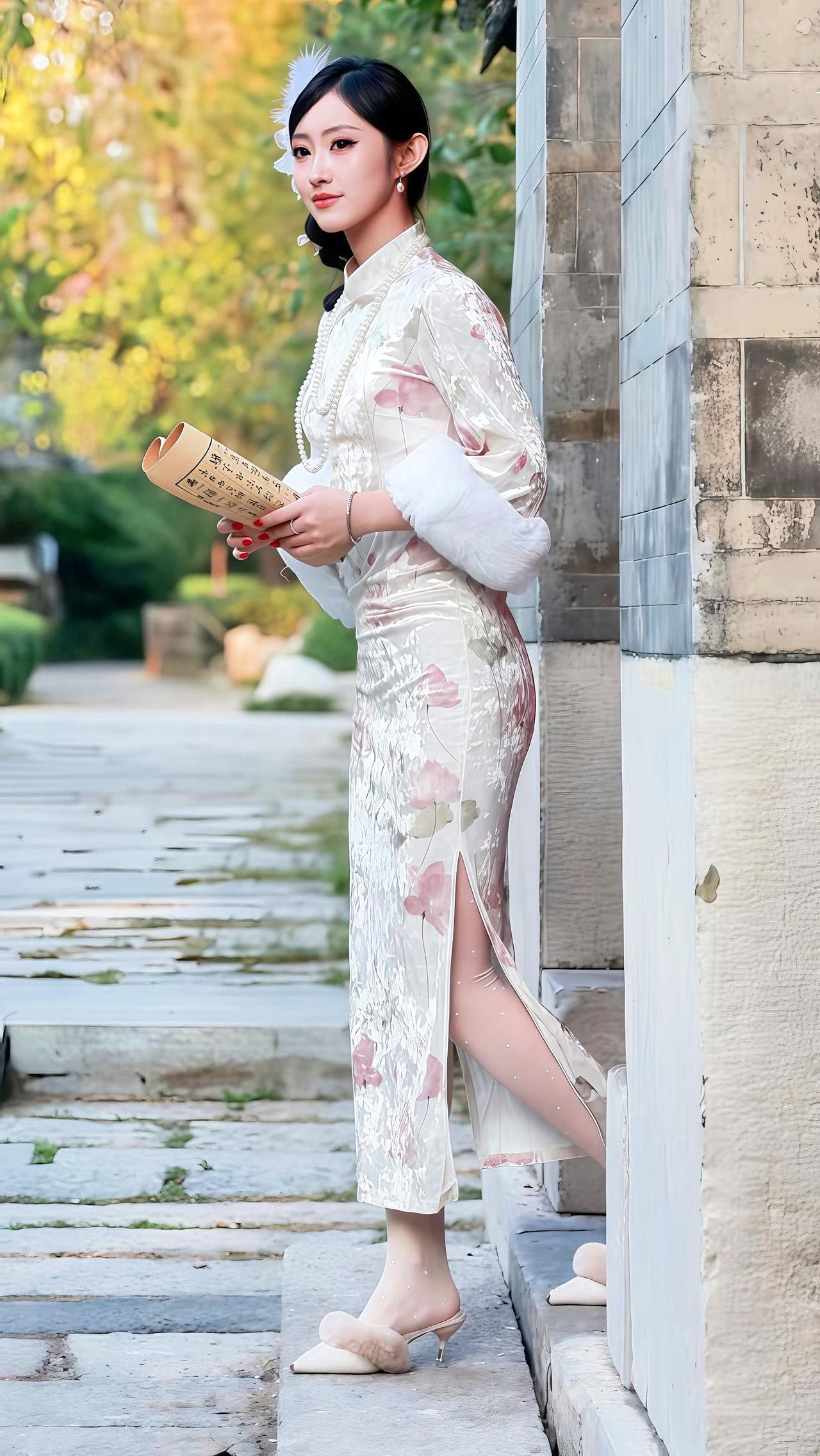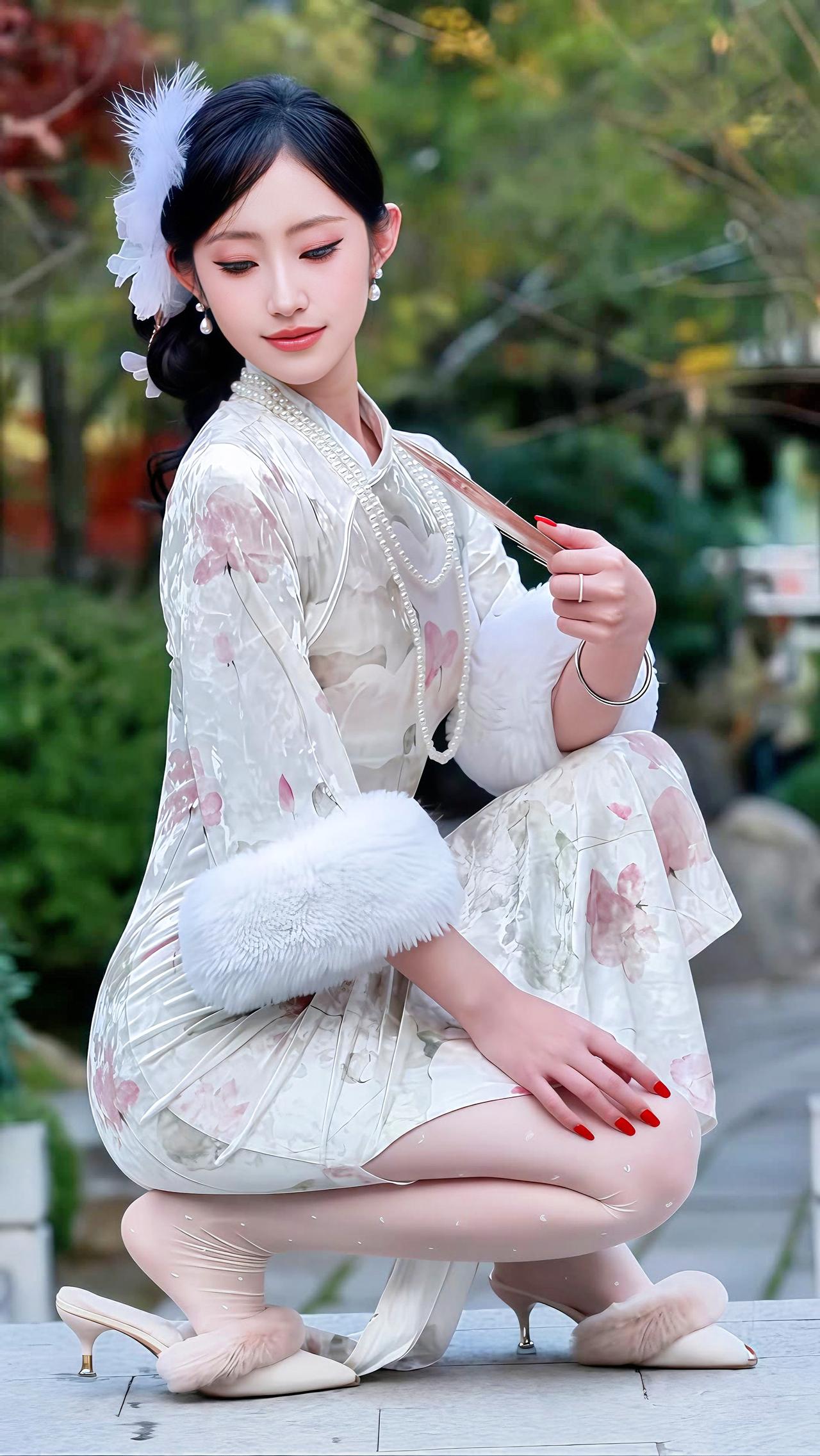 古风少女与花相伴,静坐石旁,宛如画中人。