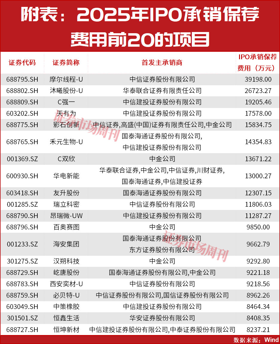 明星半导体企业、专注于半导体晶圆测试探针卡赛道的强一股份(688809.SH),科创板IPO承销选择了中信建投证券,其1.9亿元的承销保荐费用成为2025年发行成本第三高项目。