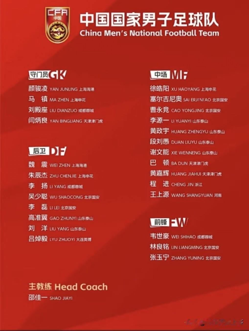 元旦伊始,国足新晋主帅邵佳一公布了首期邵家军的成员名单。泰山六将入围排面拉满。