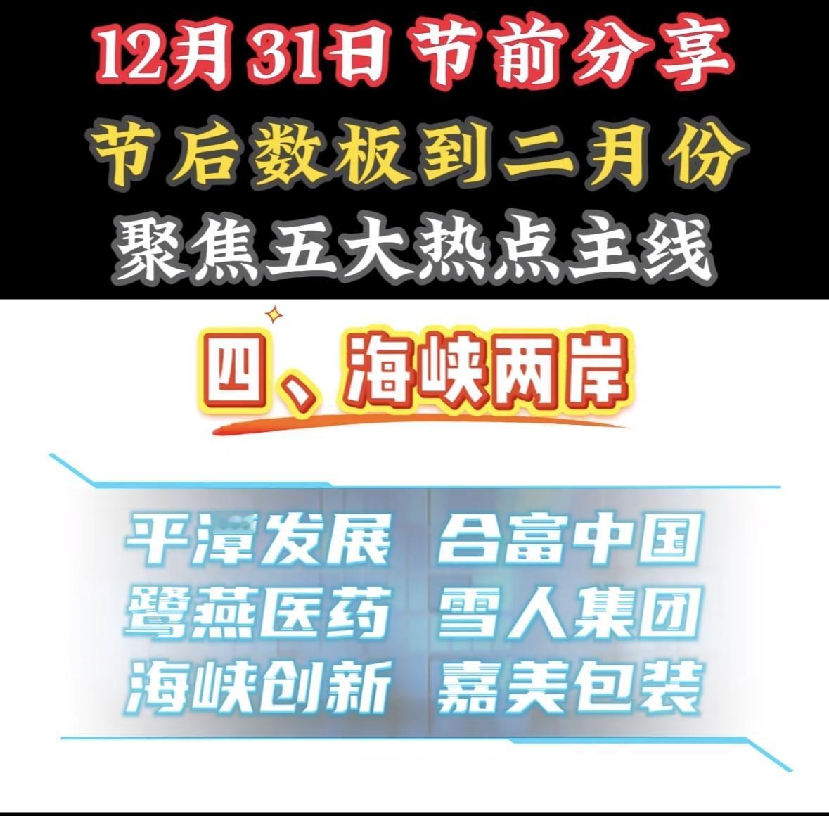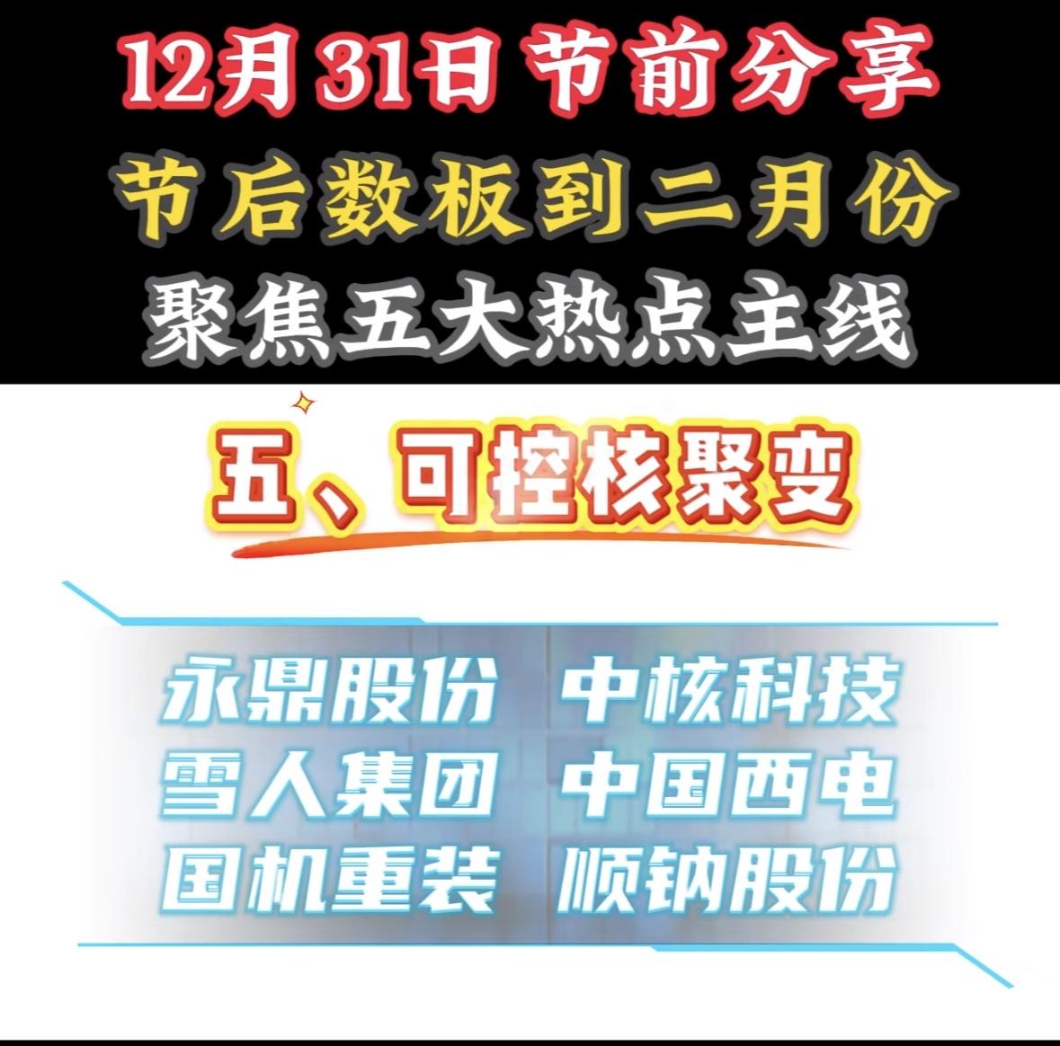 1月5日节前分享:五大热点主线, 聚焦可控核聚变! "节前布局五大热点:人形机器人、 汽车零部件、线缆、电机驱动, 关注龙头股动向,把握二月行情机遇。"
