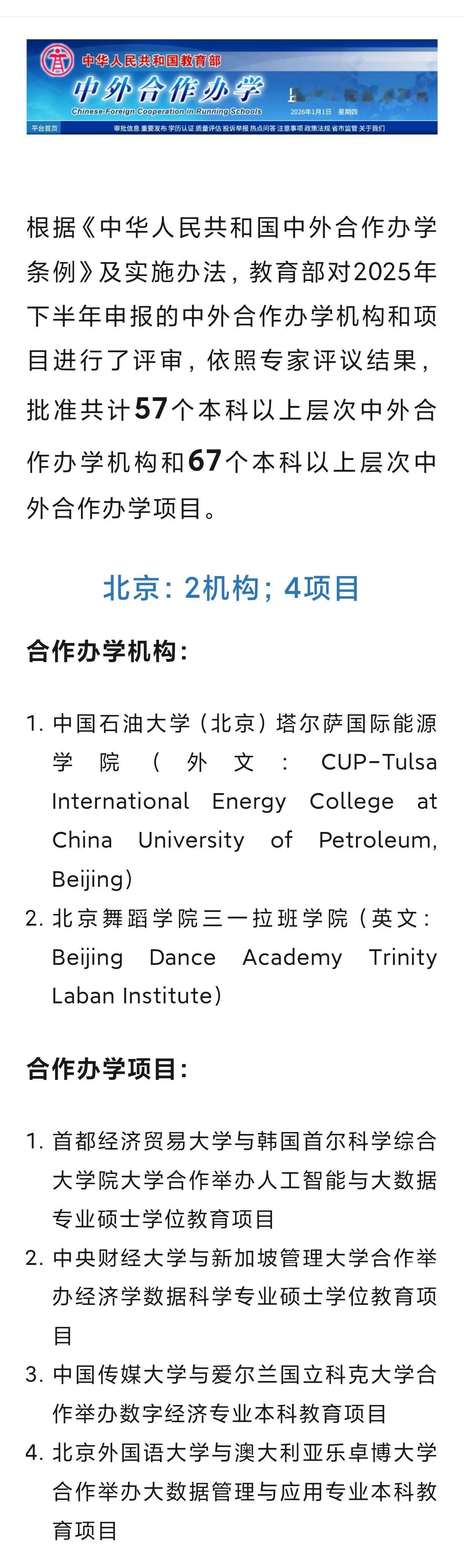 新年刚到,就有新的好消息,一批中外合作办学项目获得批准,快来先睹为快! 本次也就是2025年下半年,国家教育部共批准57个本科以上层次中外合作办学机构和67个本科以上层次中外合作办学项目,其中不乏国外知名高校,比如新加坡南洋理工大学,奥克兰大学,新加坡管理大学,澳大利亚西澳大学和加拿大渥太华大学等。 中外合作办学是差异化教育的选择,有说好的有说不好的,其实好不好在于各人,在于你看重什么和它能给与你什么。 它有优势:升学对接海外更便利,融合中外教学资源,比直接留学成本更低。但是,它也有风险:项目质量参差不齐,学费偏高,需确认教育部备案,否则学历可能无法认证。 如何筛选呢?关键是查备案、看外方院校实力、核师资、算性价比。