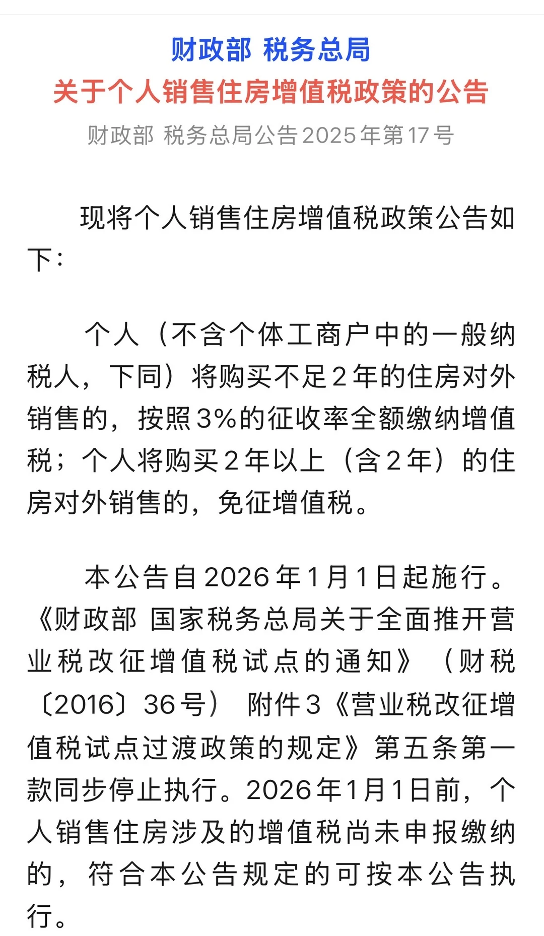 时隔十年,个人住房增值税迎来全国性统一调整!财政部重磅公告不仅直接拉低二手房交易成本,更标志着楼市调控从“因城施策”向“全国统揽”转变,对普通人买房卖房影响深远👇