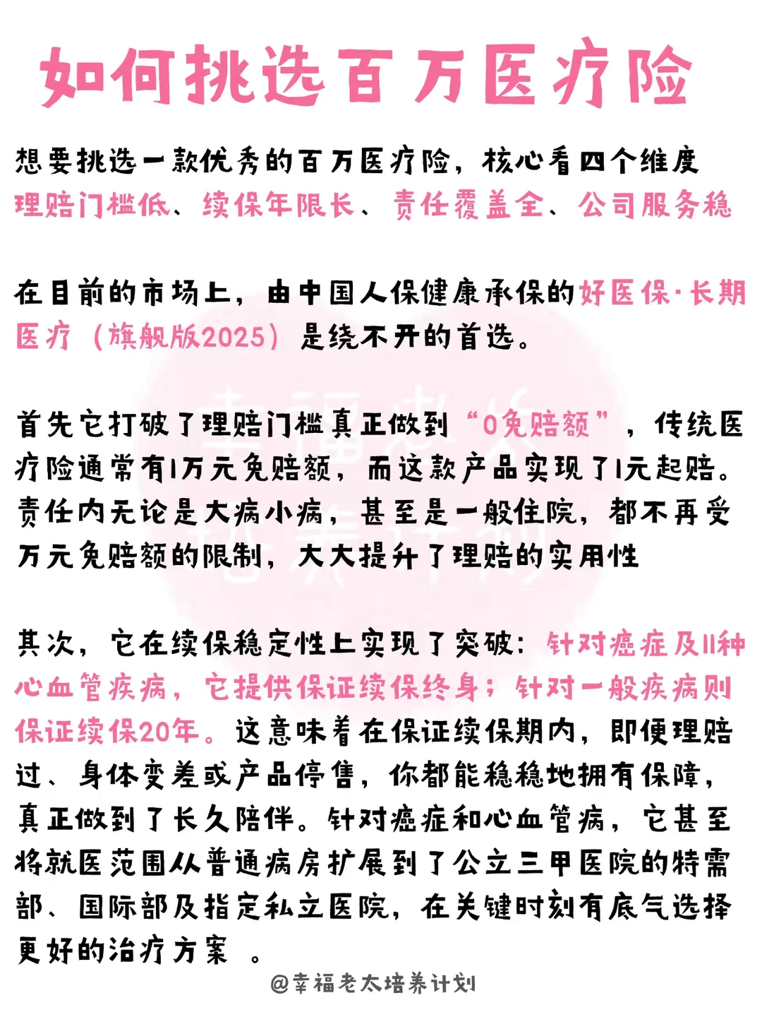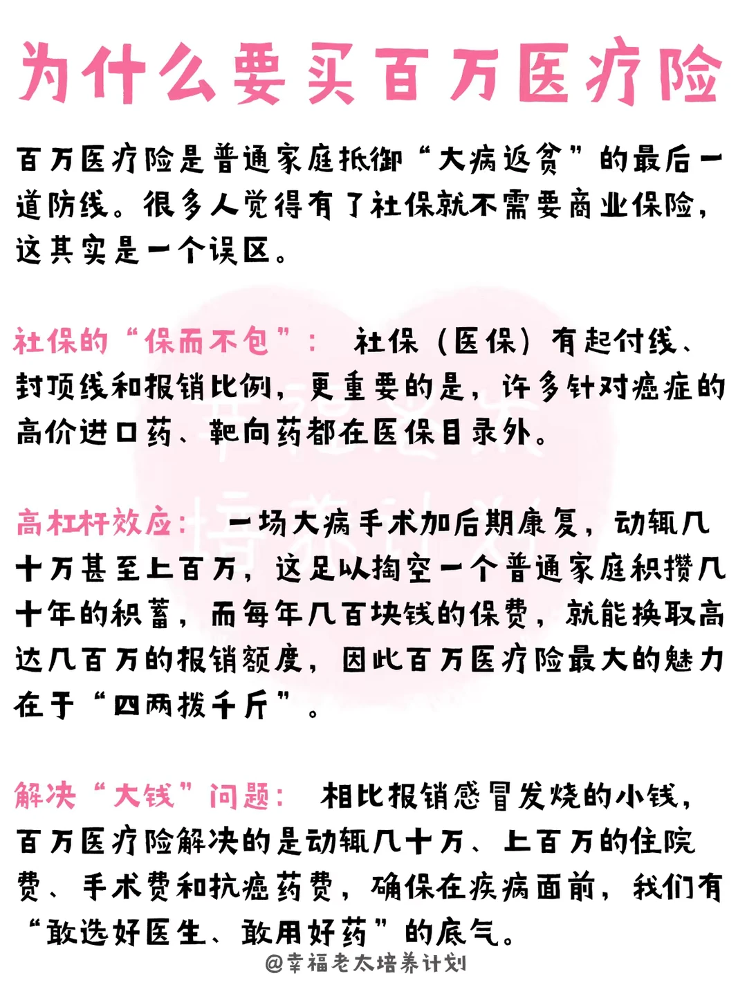 很多朋友问,我有医保了,还有必要买百万医疗险吗?怎么选才不会在理赔时“抓瞎”?今天一次性帮大家讲清楚! 要知道,百万医疗险是普通家庭抵御“大病返贫”的最后一道防线。很多人觉得有了社保就不需要商业保险,这其实是一个误区。 社保的“保而不包”: 社保(医保)有起付线、封顶线和报销比例,更重要的是,许多针对癌症的高价进口药、靶向药都在医保目录外。 高杠杆效应: 一场大病手术加后期康复,动辄几十万甚至上百万,这足以掏空一个普通家庭积攒几十年的积蓄,而每年几百块钱的保费,就能换取高达几百万的报销额度,因此百万医疗险最大的魅力在于“四两拨千斤”。 解决“大钱”问题: 相比报销感冒发烧的小钱,百万医疗险解决的是动辄几十万、上百万的住院费、手术费和抗癌药费,确保在疾病面前,我们有“敢选好医生、敢用好药”的底气。 所以买保险买的就是一份“确定性”。如果你还在纠结,可以直接上支付宝搜「好医保旗舰版」 。趁年轻、身体健康时尽早配置,为自己和家人做好兜底。