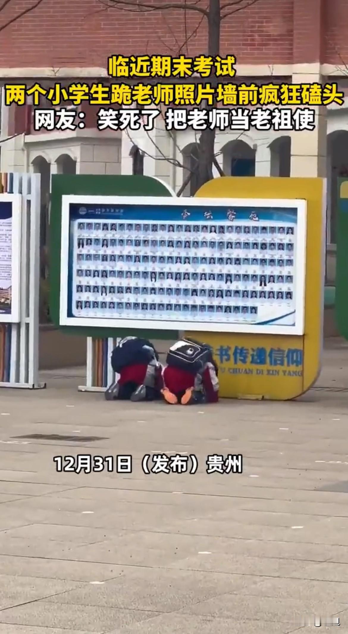 这俩孩子,算是把考前仪式玩到顶配了。 以前我们考试前,顶多转转锦鲤,在铅笔盒里写个“必胜”。他们倒好,直接行大礼。这仪式感,拉满了。 你说这是迷信吗?也是,也不是。更像是一种心理操作。面对自己没法完全掌控的事,总得干点啥,让自己觉得“我努力过了”,哪怕这努力的方向有点歪。 这照片墙也算见证了历史。以前是“优秀教师展示”,今天成了“临时许愿池”。功能升级了。 每个时代的考生,都有自己的考前玄学。我们那会儿是幸运笔,他们是网络锦鲤,到这俩孩子,直接复古,磕上了。形式在变,里头那份紧张和期待,从来没变过。 没啥可骂孩子的。等他们长大,回头看自己对着照片磕头的视频,估计自己都得笑疯。谁还没点黑历史呢。 就是不知道老师们什么心情。自己的证件照,突然承受了这么多不该承受的愿望。可能也挺懵的。 热闹看完,该复习复习,该考试考试。分数嘛,终究是笔写出来的,不是头磕出来的。 但那一瞬间的虔诚,是真的。那种想变好的迫切,也是真的。只是下次,换个方式吧。