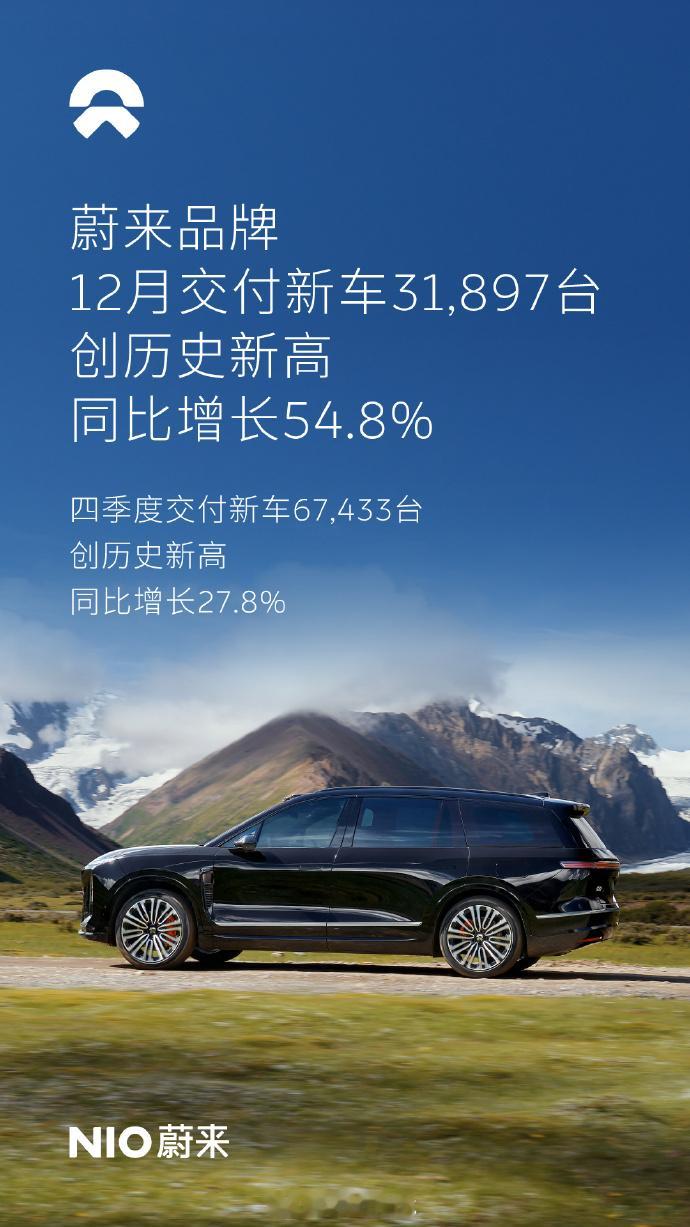 蔚来公司12月交付新车48135台,同比增长54.6%-蔚来品牌交付