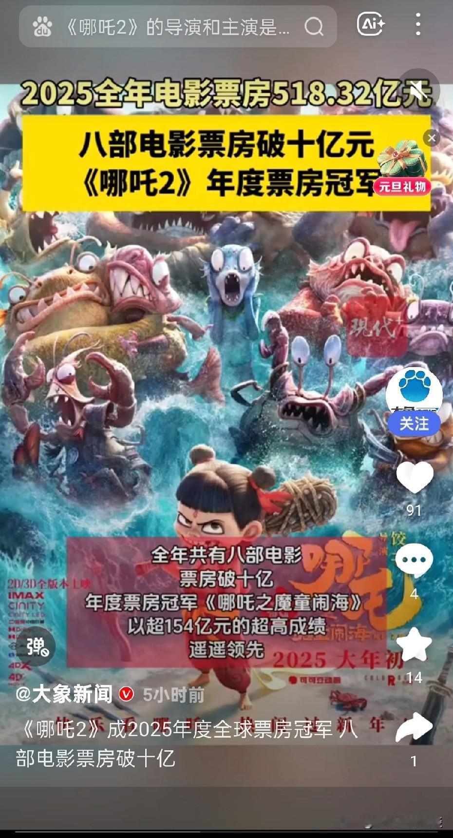 《哪吒2》成2025年度全球票房冠军哪吒2票房榜哪吒票房排名2025年电影界