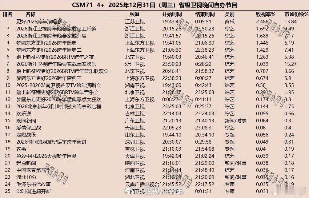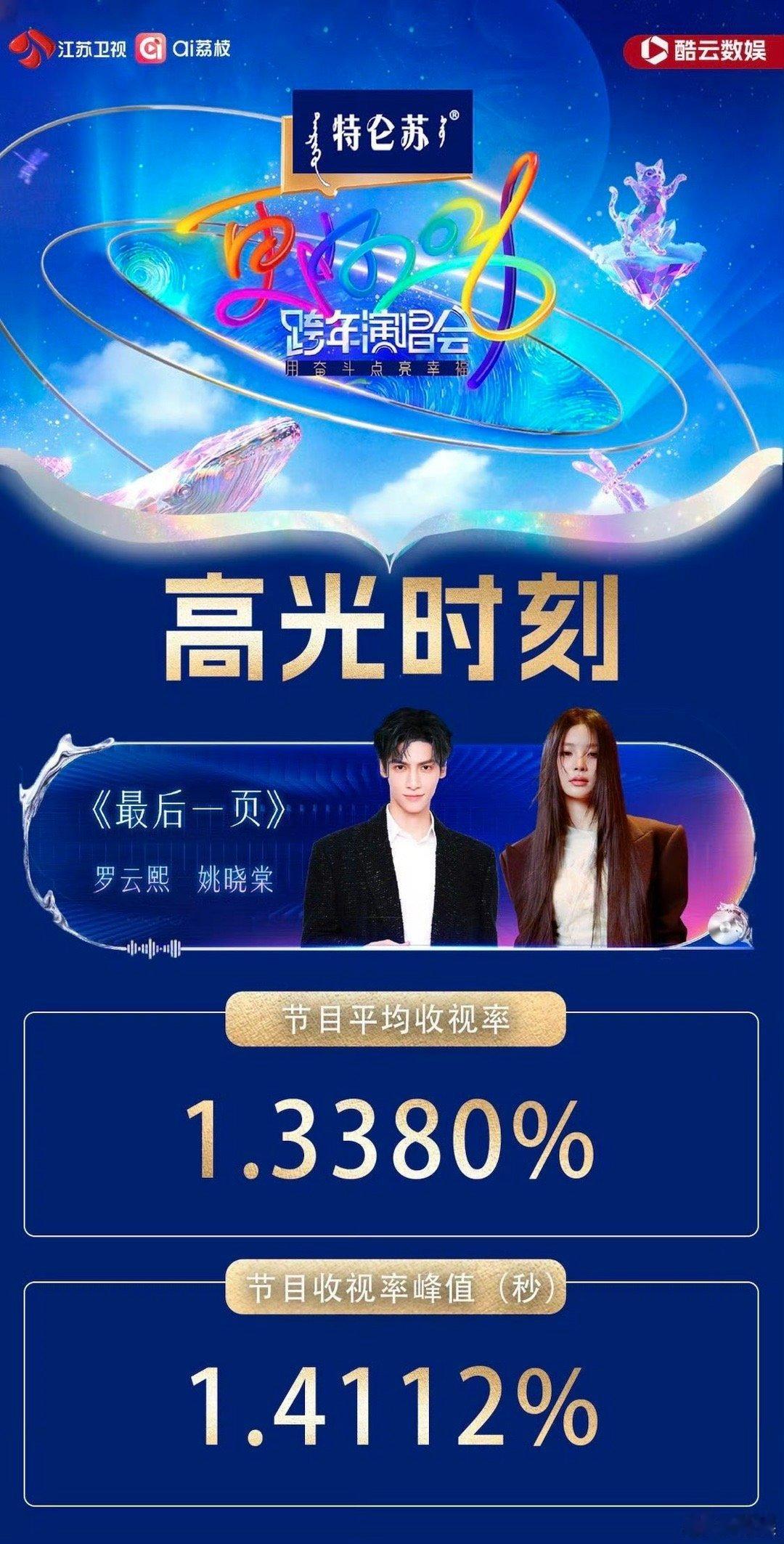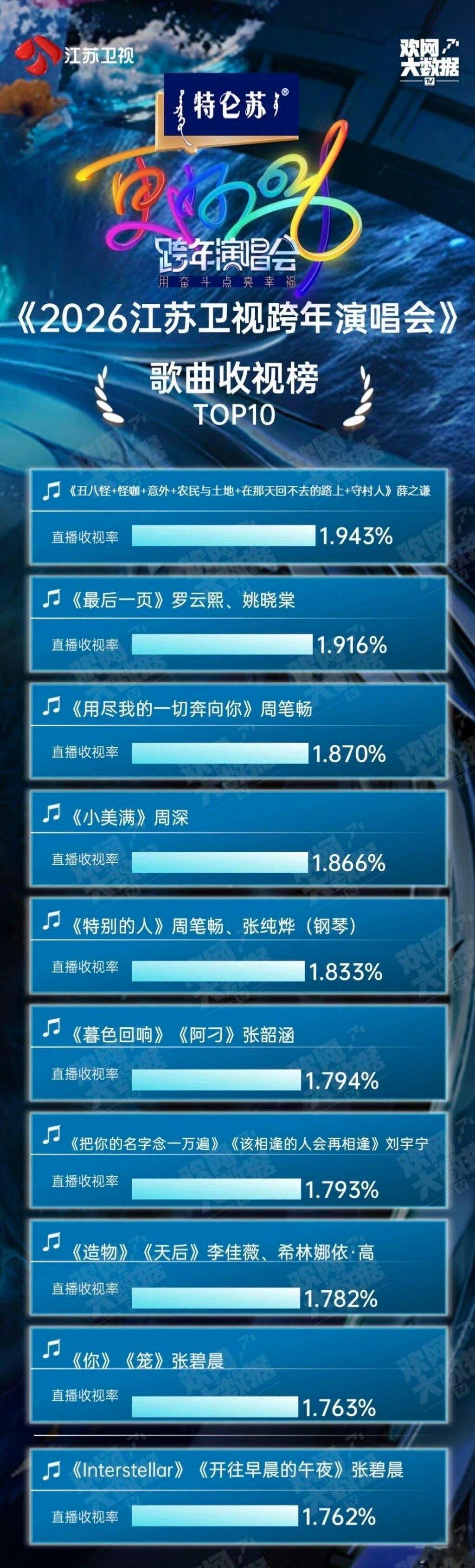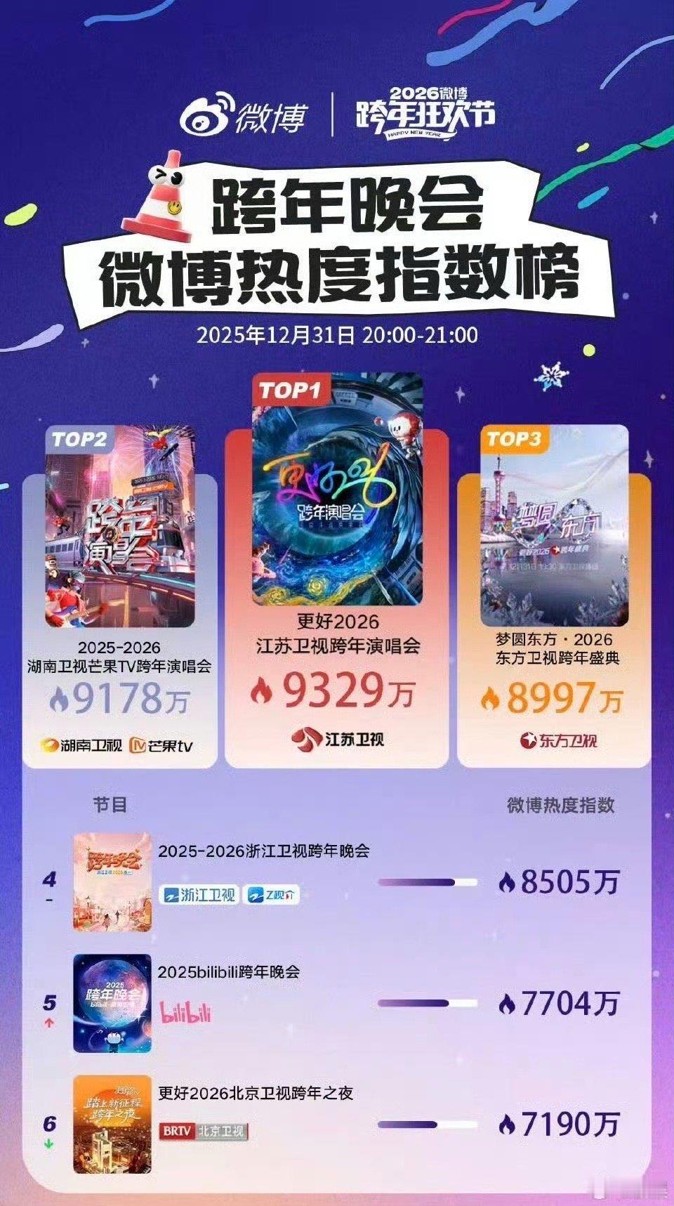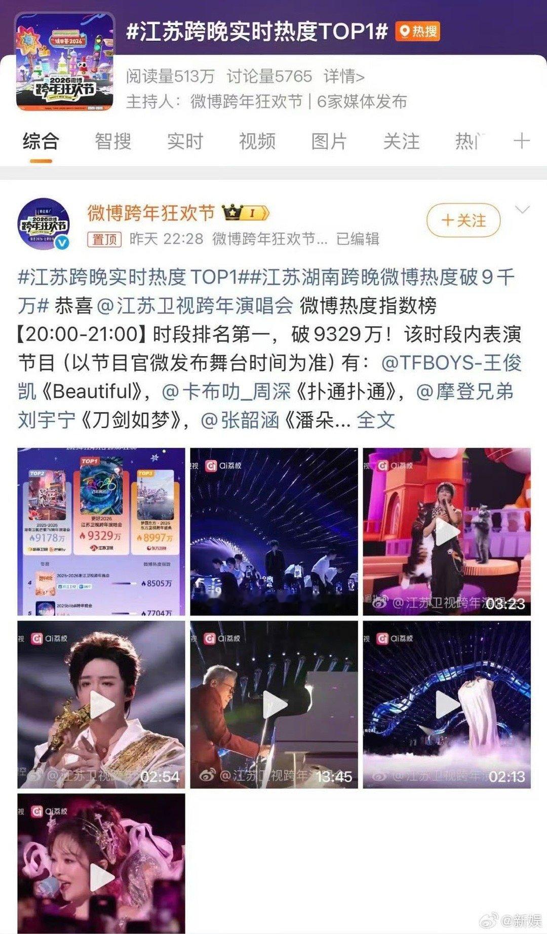 跨年榜一是江苏卫视 江苏卫视这次跨年真的把“实力”两个字写在了公屏上!全域收视率第一,全网热搜霸屏,全程上宣无死角,互动热度全方位拉满——从电视屏幕到手机微博,昨晚的朋友圈属于江苏卫视!这波“六连冠”拿得又稳又响亮!