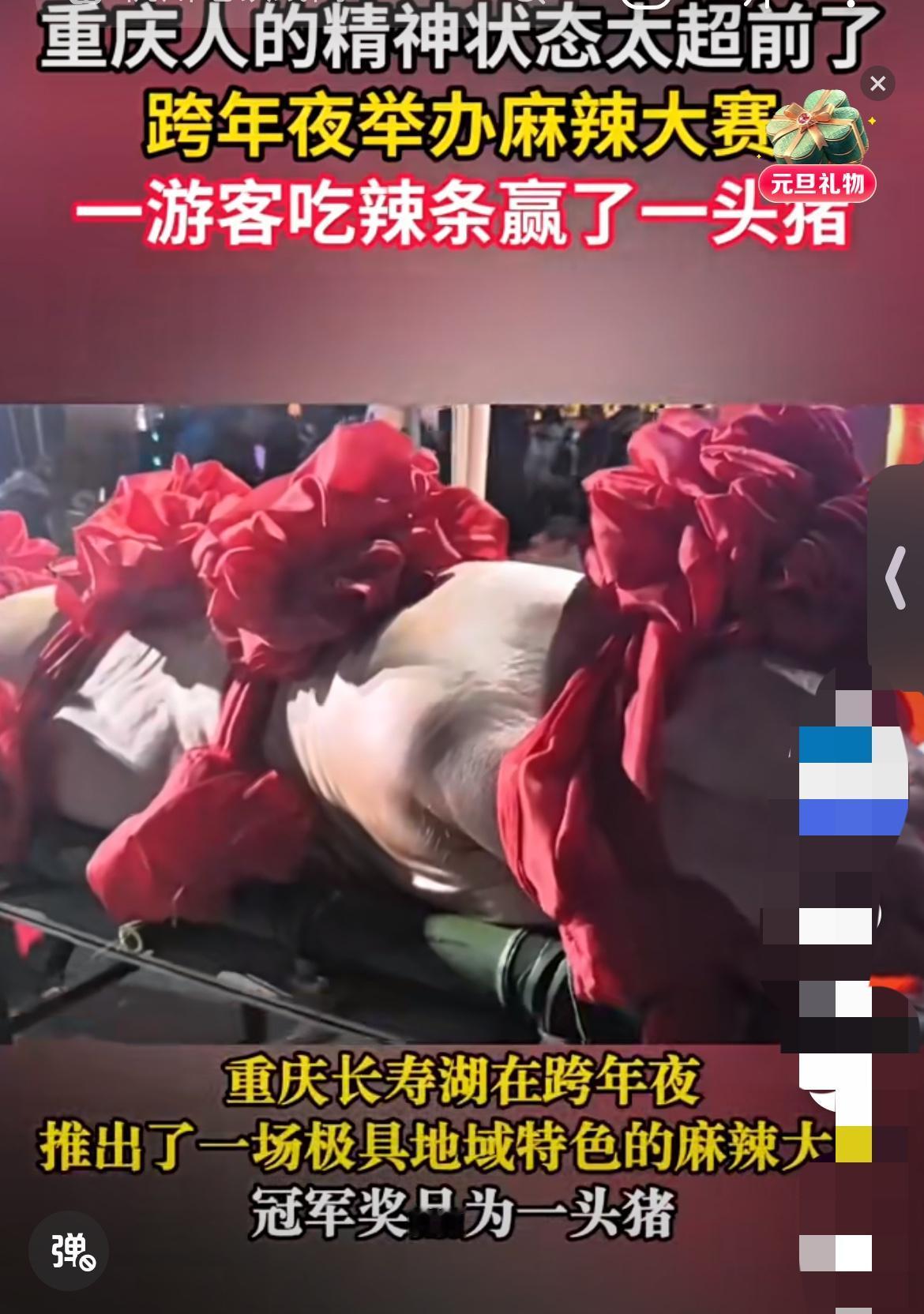 “这比赛辣度不是问题,主要是牙口得好!”刚从“麻辣大赛”擂台上赢下一头300斤大肥猪的新疆柴大哥,笑着分享了他的夺冠心得。 在重庆一家景区的跨年夜,这场名为“吃辣条,赢年猪”的活动吸引了众多游客现场报名。10名从初赛中脱颖而出的选手,在决赛里面对的是升级的终极挑战:他们需要依次吃完麻辣蛋糕、麻辣牛肉和小米辣等多种辣味食物,最后再解决一大包辣条,速度最快的人才能把大奖抱回家。 这场关乎味蕾极限的较量,最终被一位来自新疆石河子的游客柴先生以压倒性的表现终结。他成功赢取了那份极具冲击力的跨年大礼——一头重达300多斤的活猪。这份奖品超越了常见的奖金或消费品,直接戳中了中国人关于丰收与年味的最朴实情感。 比赛的辣度令人咋舌,但如何处理这个“庞然大物”奖品更是个现实问题。柴先生和妻子是来重庆旅游的,带着一头活猪回新疆显然不现实。主办方当晚就帮忙把这头猪处理了,猪肉被分装成10大袋。柴先生自己留下了2袋,一路从景区扛到了重庆市区,他感慨道:“真是累啊,两袋子猪肉,感觉有50斤重。” 其余的8袋猪肉,他直接就地卖掉了。这还没完,剩下的肉他也没打算浪费,已经在市区找好了加工店家,准备把这些猪肉灌成香肠,之后快递回新疆老家。一场热辣的跨年比赛,最终转化成了一份能邮寄回家的、实实在在的年味。 这场山城跨年夜的热辣插曲,您怎么看?欢迎在评论区聊聊您的想法。 [免责声明]文章的时间、过程、图片均来自于网络,文章旨在传播正能量,均无低俗等不良引导,请观众理性看待本事件,切勿留下主观臆断的恶意评论,互联网不是法外之地。本文如若真实性存在争议、事件版权或图片侵权问题,请及时联系作者,我们将予以删除。