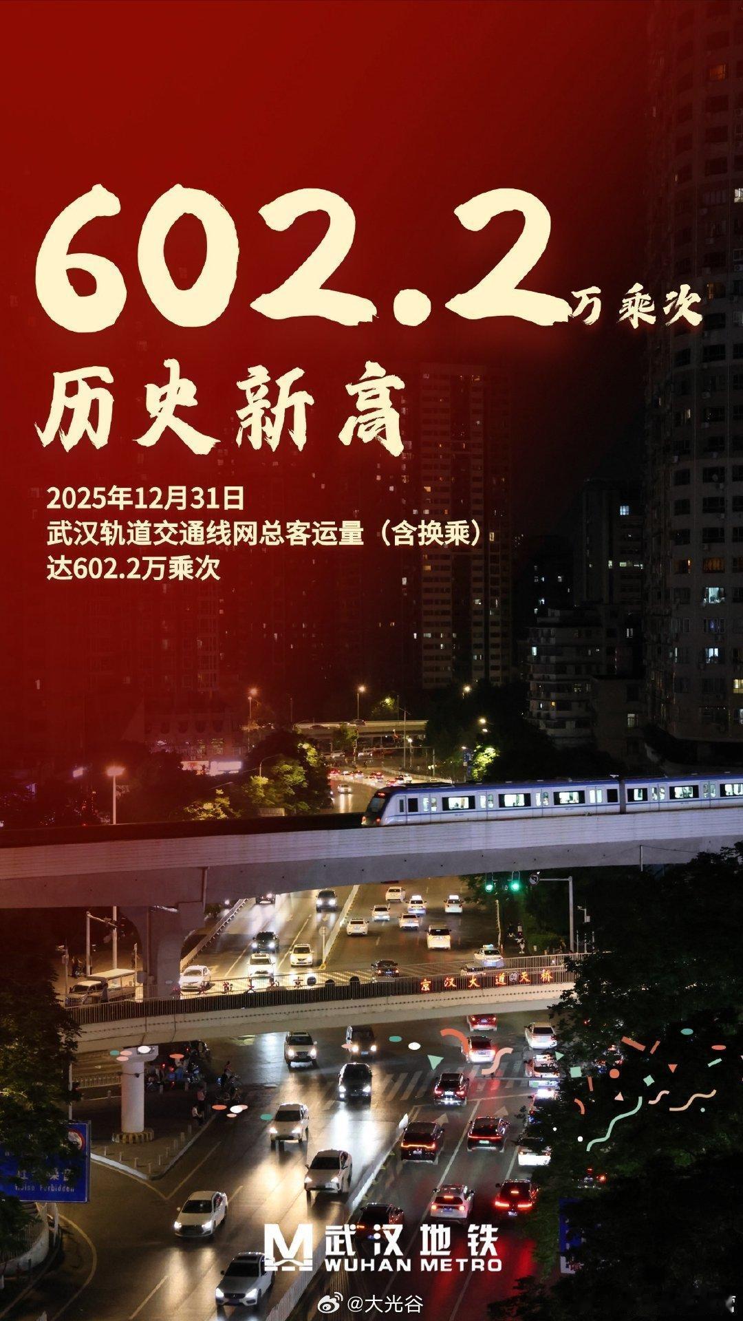 602.2万!武汉地铁客流创新高 据武汉地铁运营的消息,2025年12月31日(周三),武汉轨道交通线网客运量(含换乘)为602.2万乘次,首次突破600万并打破2024年9月14日创造的597.54万客流纪录再创新高。