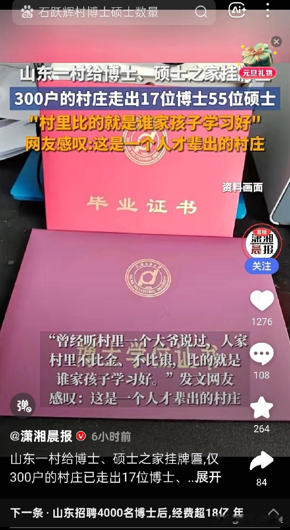 山东一300户村庄有17位博士55位硕士潍坊村 西张村 山东潍坊青州市益都街道西张村太牛了!这300户的小村庄,自恢复高考以来,走出了17位博士、55位硕士和104位本科生,简直是人才摇篮。 村里有重视教育的传统,不比金银比成绩,还有“博士榜”“光荣榜”记录考出去的孩子。今年街道还给硕博家庭挂了“硕士之家”“博士之家”牌匾。而且没有优质资源,靠的是普通家庭“再穷不能穷教育”的坚守、村集体引导和返乡学子反哺。这说明良好的家风民风能孕育人才,也为乡村振兴提供了精神动力。