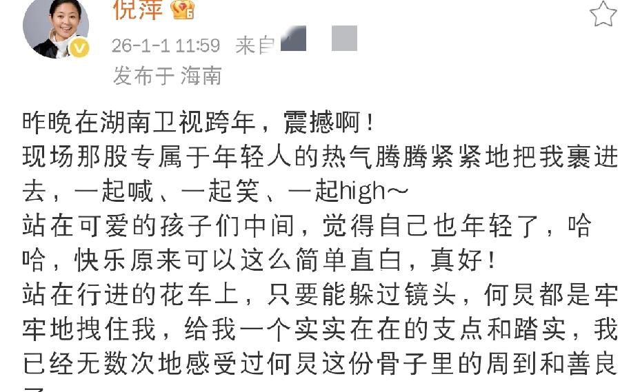 12月31日晚上,倪萍老师也参加了跨年晚会主持,她说真的相当震撼呀,因为现场都是热气腾腾的年轻人嘛,活力四射,倪萍老师掺和在年轻人之中,也觉得自己年轻了许多。 倪萍老师还提起了何炅,并且对何炅老师那是赞不绝口呀:站在行进的花车上,只要能躲过镜头,何炅都是牢牢地拽住我,给我一个实实在在的支点和踏实 她罕见和何炅一起主持,她感受到了何炅骨子里的周到和善良,倪萍老师还晒出了合照,图片中,四位主持人看向摄像头,都给人很惊艳的感觉。 有网友表示:倪萍老师挺厉害,你参与的节目创造了昨晚全国最高人气,达到2.46,真牛[赞]