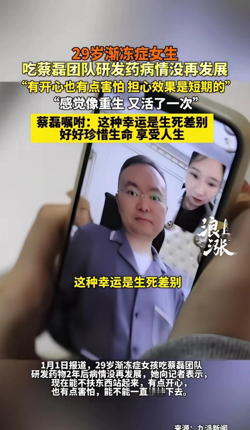 29岁渐冻症女生,吃蔡磊团队研发的药病情没有再发展。 女生直言有开心也有害怕,“感觉像重生,又活了一次” 这简直是生命的奇迹!2026年新年公开信里,蔡磊说渐冻症必然被攻克,多名患者用了药回归健康。小刘吃了两年药,能站起来、独居自理还能兼职。她既开心又害怕,不知病情能否一直稳定。看着姑娘现在一切正常,希望她勇敢面对生活,不要被困难打到。 可看看蔡磊,全身只剩眼球能动,失去语言功能,处境艰难。他毕业名校,履历耀眼,患病后仍为攻克渐冻症努力。 蔡磊嘱咐回归健康的患者:这种幸运是生死差别,好好珍惜生命,享受人生。 蔡磊自己团队研发的药对别人有效,对自己却没有效果,命运真是捉弄人,希望蔡磊坚持住,也期待奇迹发生。 其实只有经历过死亡的人才会理解生命的意义,只有垂死挣扎的人才能真正体会健康的可贵。 之前“冰桶挑战”让渐冻症被更多人知道,但这病依旧可怕。小刘是幸运的,也盼着有更多患者能像她一样,蔡磊的努力能拯救更多生命。