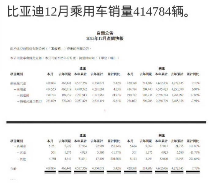比亚迪全年累计销量4602436辆 比亚迪1月1日发布2025年12月产销快报,当月新能源汽车销量420398辆,同比下滑约18.2%;2025年全年累计销量4602436辆,同比增长7.73%。其中纯电车型12月销量190712辆;纯电车型全年累计2256714辆,同比大增27.86%。 多家车企公布2025全年成绩单