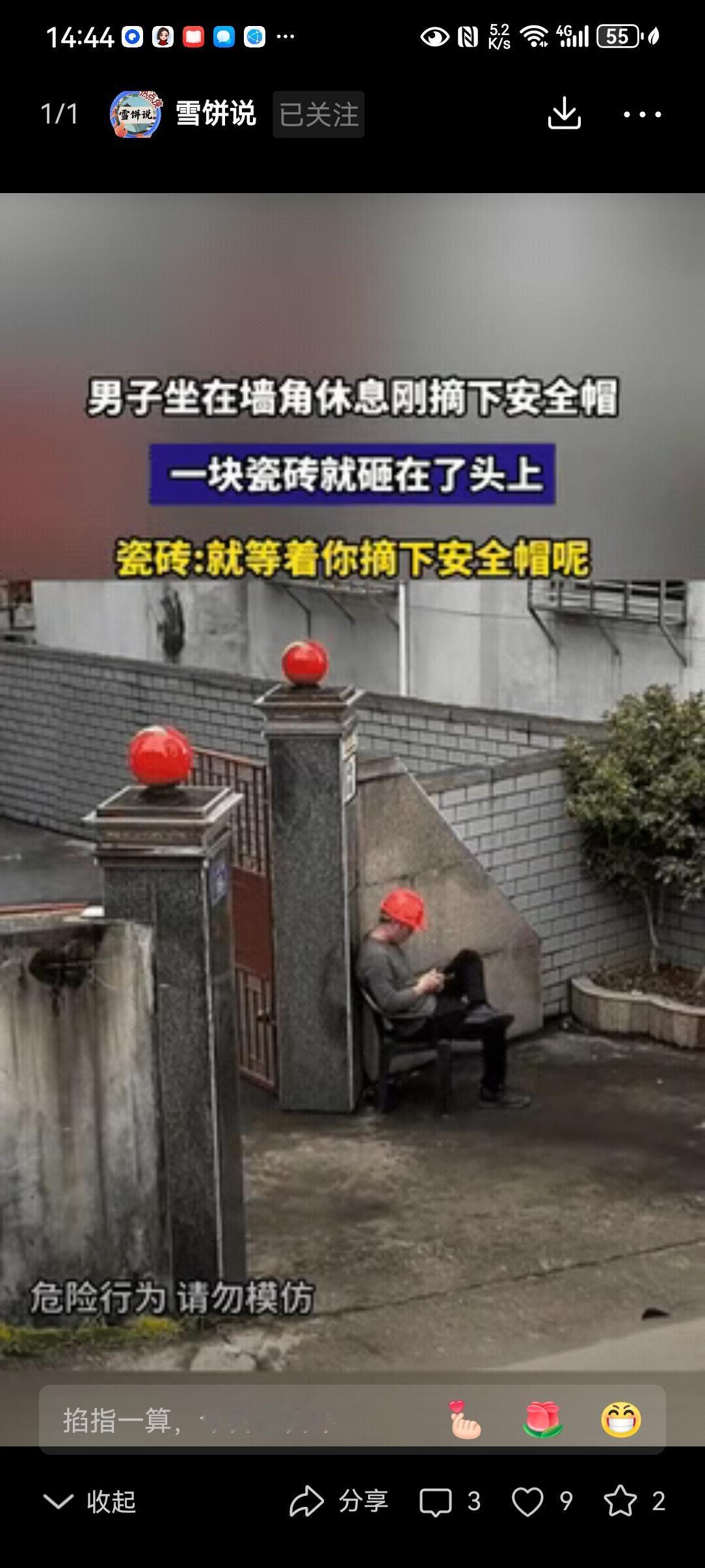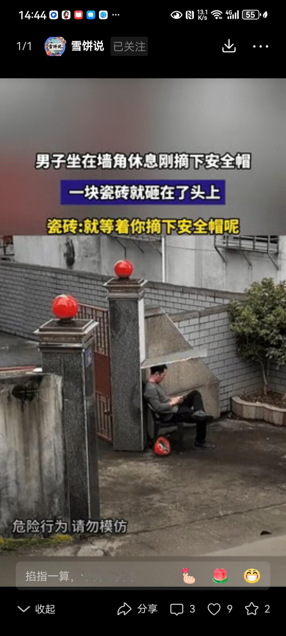 这下解释不清了!福建,一位装修师傅带着安全帽干活,看到墙角有个椅子,就想着坐上去歇一会,万万没想到,他刚把安全帽摘下来,头顶的瓷砖就砸了下来,网友:瓷砖就等着你摘帽子呢! 福建的装修工地里,师傅忙了半晌,总算得空歇口气。 墙角摆着把椅子,他走过去坐下,掏出手机刷了起来。 头上的安全帽还好好戴着,只是帽檐挡着视线,看手机实在别扭。 师傅随手把安全帽摘下来,放在了脚边。 几乎就在同一时间,头顶的瓷砖突然脱落,结结实实砸在他头上。 监控记录下这惊险的一幕,任谁看了都忍不住心头一紧。 网友们纷纷调侃,这瓷砖像是掐着点来的。 可玩笑背后,藏着的是最现实的安全警示。 很多人干活时规规矩矩戴安全帽,一歇下来就随手摘掉。 总觉得坐着刷手机,手里没拿工具,就没什么危险。 殊不知,施工现场的危险,从不会因为人休息就消失。 松动的建材、未固定的结构、高处的悬挂物,都是隐形的威胁。 安全装备从来不是应付检查的摆设,也不是“关键动作”的专属。 它防的不是自己的失误,而是那些无法预料的意外。 你永远不知道危险会在何时降临,但安全帽戴在头上,就多了一份生的希望。 这起事件也给所有人提了个醒:在危险环境里,安全这根弦,一刻都松不得。