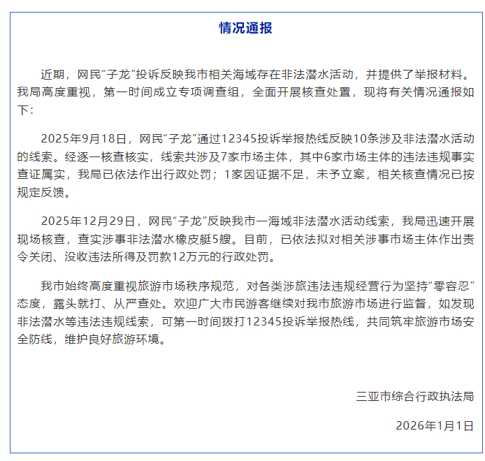 【#三亚通报相关海域存在非法潜水活动#】海南三亚市综合行政执法局1月1日发布情况通报:近期,网民“子龙”投诉反映我市相关海域存在非法潜水活动,并提供了举报材料。我局高度重视,第一时间成立专项调查组,全面开展核查处置,现将有关情况通报如下:2025年9月18日,网民“子龙”通过12345投诉举报热线反映10条涉及非法潜水活动的线索。经逐一核查核实,线索共涉及7家市场主体,其中6家市场主体的违法违规事实查证属实,我局已依法作出行政处罚;1家因证据不足,未予立案,相关核查情况已按规定反馈。2025年12月29日,网民“子龙”反映我市一海域非法潜水活动线索,我局迅速开展现场核查,查实涉事非法潜水橡皮艇5艘。目前,已依法拟对相关涉事市场主体作出责令关闭、没收违法所得及罚款12万元的行政处罚。