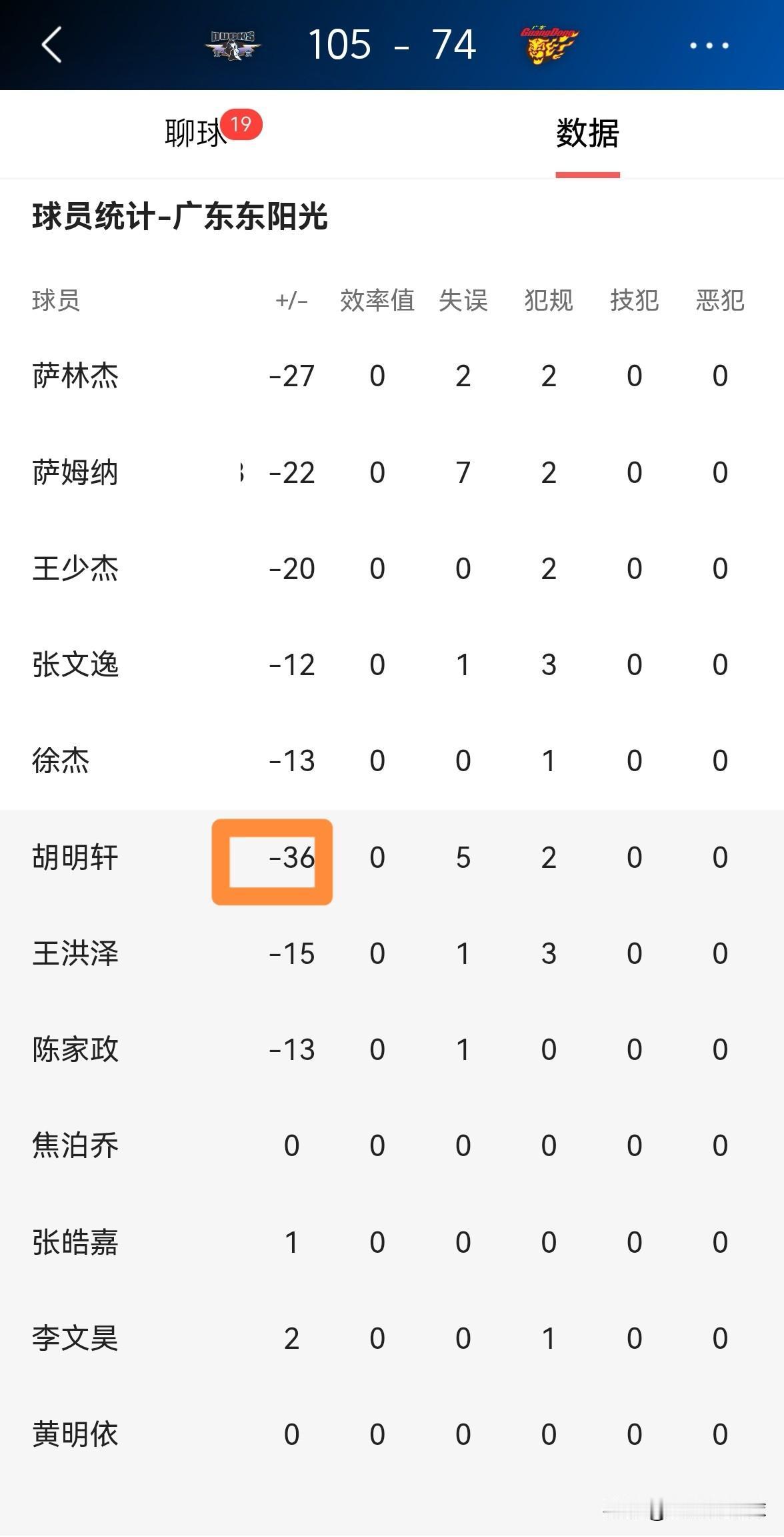 我真是被广东东阳光球星胡明轩给气疯了,他的场上正负值简直低的可怜!在今天广东东阳光客场以74:105惨败于北京北汽的比赛中,胡明轩的场上正负值为全队最低的-36。 全场比赛下来,胡明轩替补出战30分钟,投篮9中3,其中三分球5中1、罚球4中1得到8分,还出现了多达5次的失误,他的场上正负值为-36。 此时此刻,我真的希望胡明轩能够就地退役,我再也不想看他打球了。