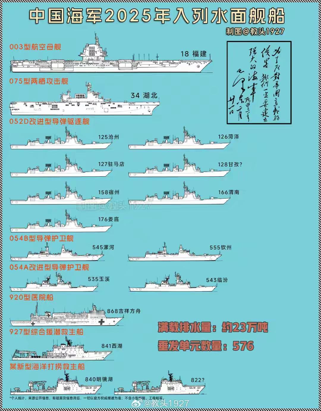 盘点中国2025年服役的军舰都有哪些?中国舰艇 军舰入列 2025年中国海军有多型军舰服役,以下是一些主要的军舰: 1, 福建舰 :11月5日入列,舷号“18”,是我国第一艘电磁弹射型航空母舰,也是我国第三艘航空母舰。其满载排水量约8.5万吨,采用平直通长飞行甲板,配置电磁弹射和阻拦装置,可搭载歼-35、空警-600等多型舰载机。  ​ 2,湖北舰:8月1日亮相,舷号“34”,是我国第四艘075型两栖攻击舰,排水量4万余吨,可搭载多架舰载直升机和726型气垫登陆艇,能快速投送登陆部队。  ​ 3, 漯河舰 :1月22日,054B型护卫舰首舰漯河舰在山东青岛某军港交接入列,舷号“545”,排水量约5000吨,在舰艇隐身技术、作战指挥系统等方面有突破。  ​ 4, 钦州舰:054B型护卫舰2号舰钦州舰于2025年官宣入列,舷号“555”。  ​ 5, 东莞舰:新批次055型驱逐舰109东莞舰于2025年底入列。  ​ 6, 渭南舰等:2025年有166渭南舰、125沧州舰、126菏泽舰、127驻马店舰、158宿州舰等多艘第四批次052D改进型驱逐舰入列。