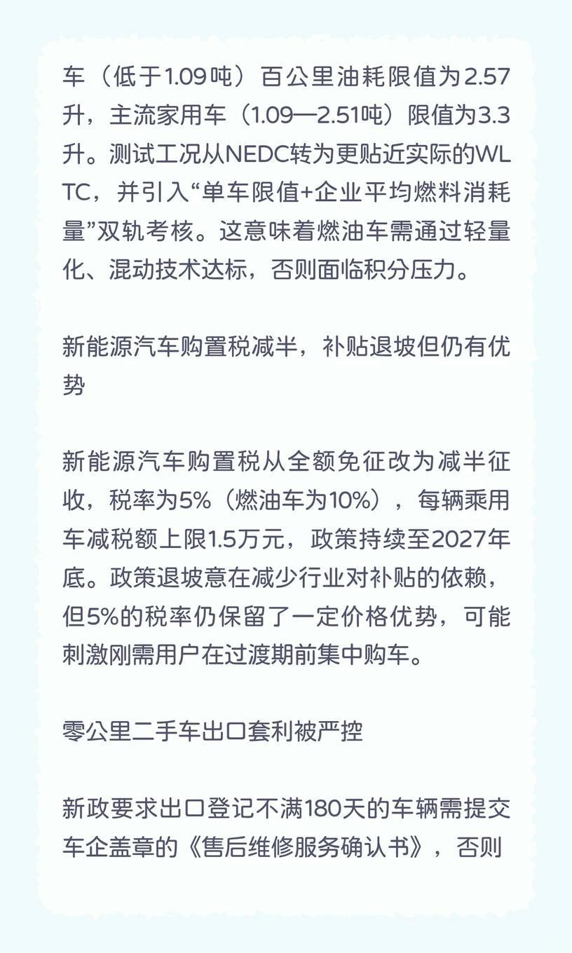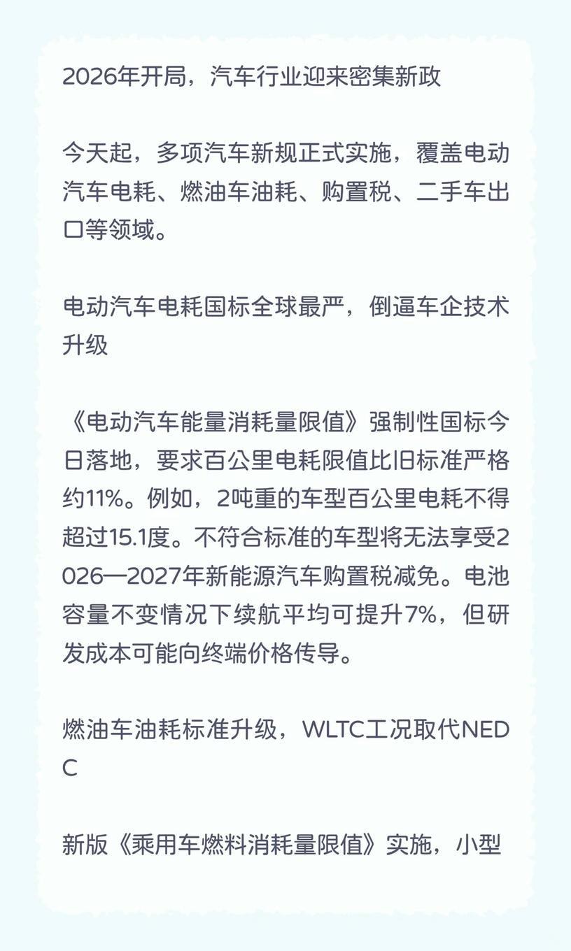 2026年1月1日汽车行业发生了什么 2026年汽车新规实施,电耗国标升级、燃油车油耗新标、新能源购置税调整,推动行业技术升级。 汽车