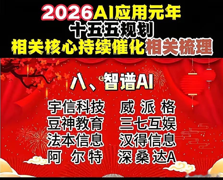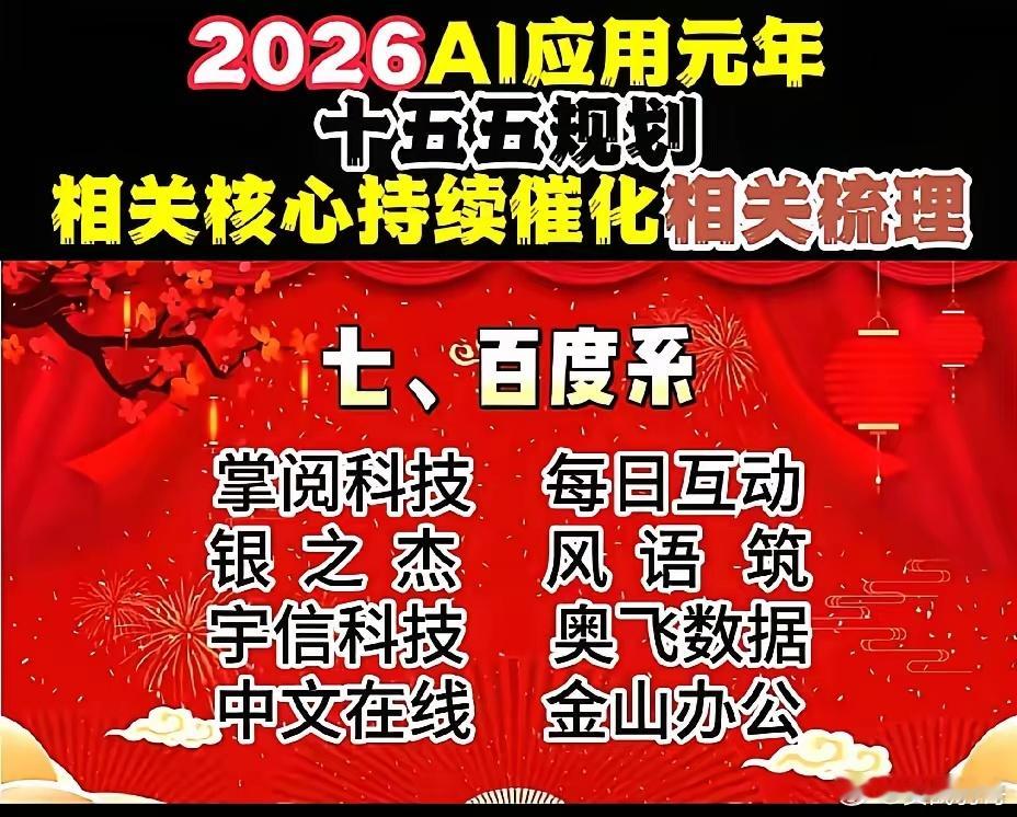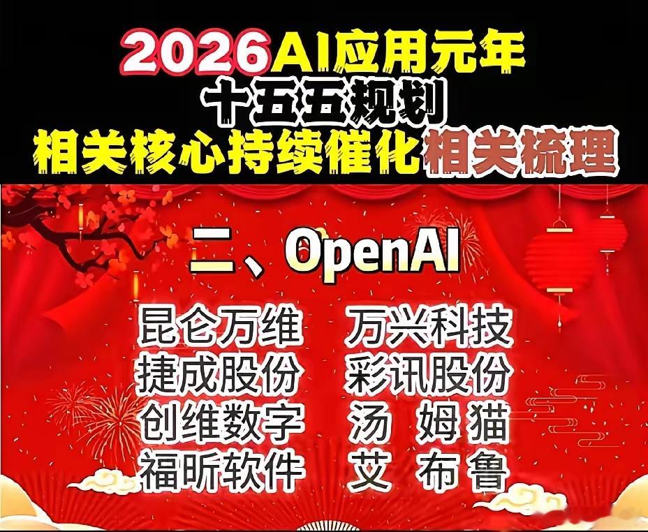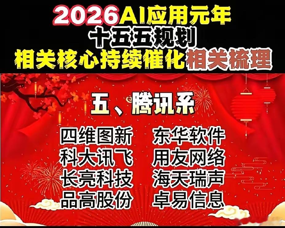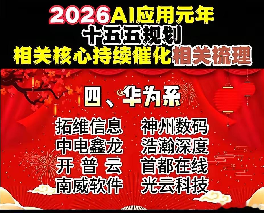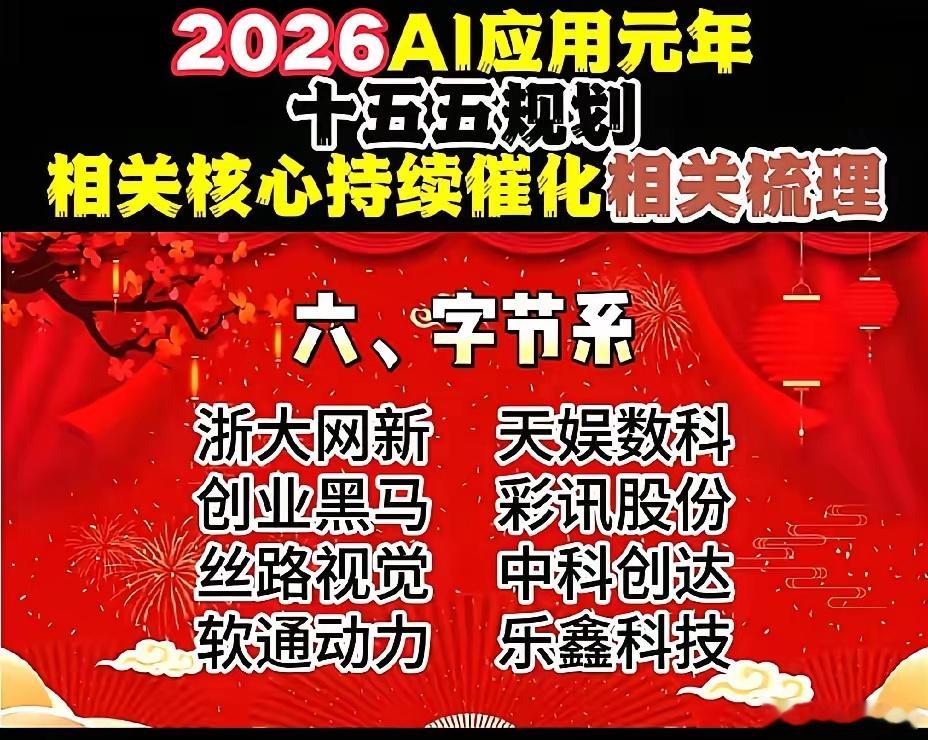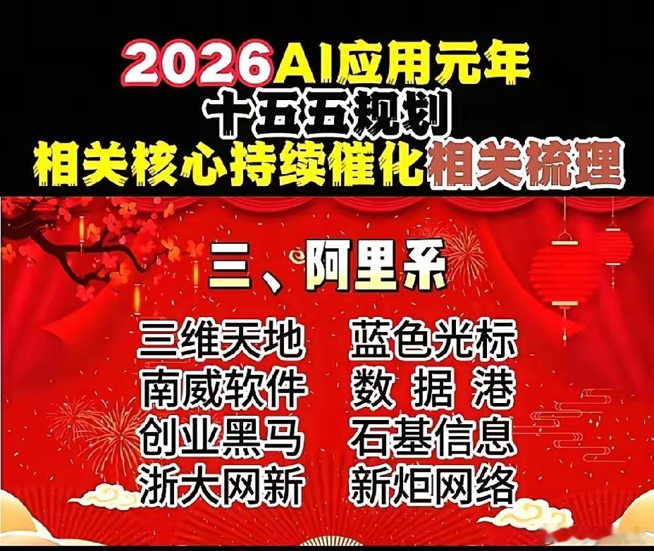 2026年1月1日,节后A股这些板块有望大涨!!!AI应用元年,十五五规划相关核心持续催化相关数列,重点关注:谷歌概念:蓝色光标、元隆雅图、易点天下;OpenAI概念:昆仑万维、万兴科技、捷成股份;阿里概念:三维天地、数据港、南威软件;华为概念:拓维信息、神州数码、开普云;腾讯概念:用友网络、长亮科技、卓易信息;字节概念:创业黑马、中科创达、天娱数科;百度概念:每日互动、银之杰、奥飞数据;智谱AI概念:豆神教育、汉得信息、法本信息;deepseek概念:拓尔思、广和通、华金资本!!!