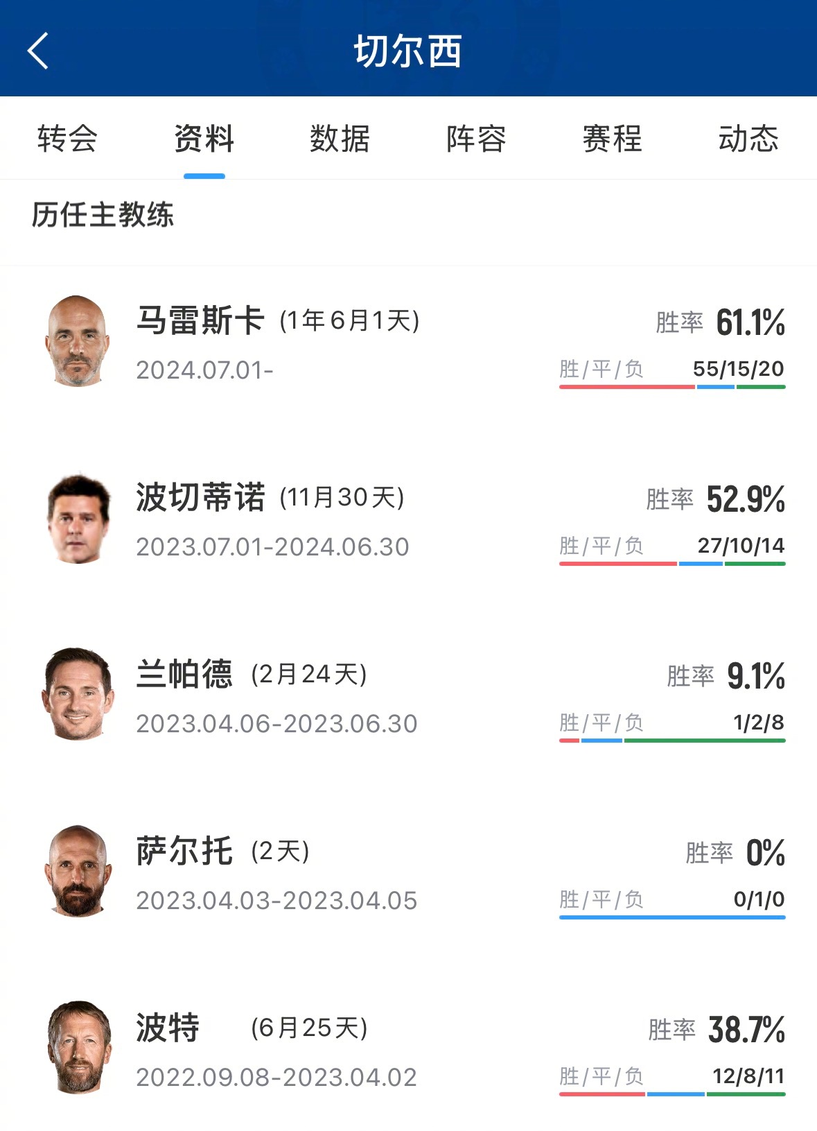 切尔西官方宣布,与主教练马雷斯卡分道扬镳。随后记者罗马诺的消息,切尔西几天内就会任命新主帅,斯特拉斯堡主教练罗塞尼尔是候选人之一。2024年夏天,马雷斯卡与切尔西达成一份5年合同,开启在蓝军的执教生涯。至今共带队参加各项赛事92场比赛,取得55胜16平21负的成绩,执教胜率59.7%,球队共打进192球,场均进球2.08;共有99粒丢球,场均丢球1.07。切尔西主教练成本“高危”工作,自2015年底至今,除开执教仅1场的代理主帅萨尔托,切尔西有过10任9位主帅(兰帕德两次执教)。切尔西