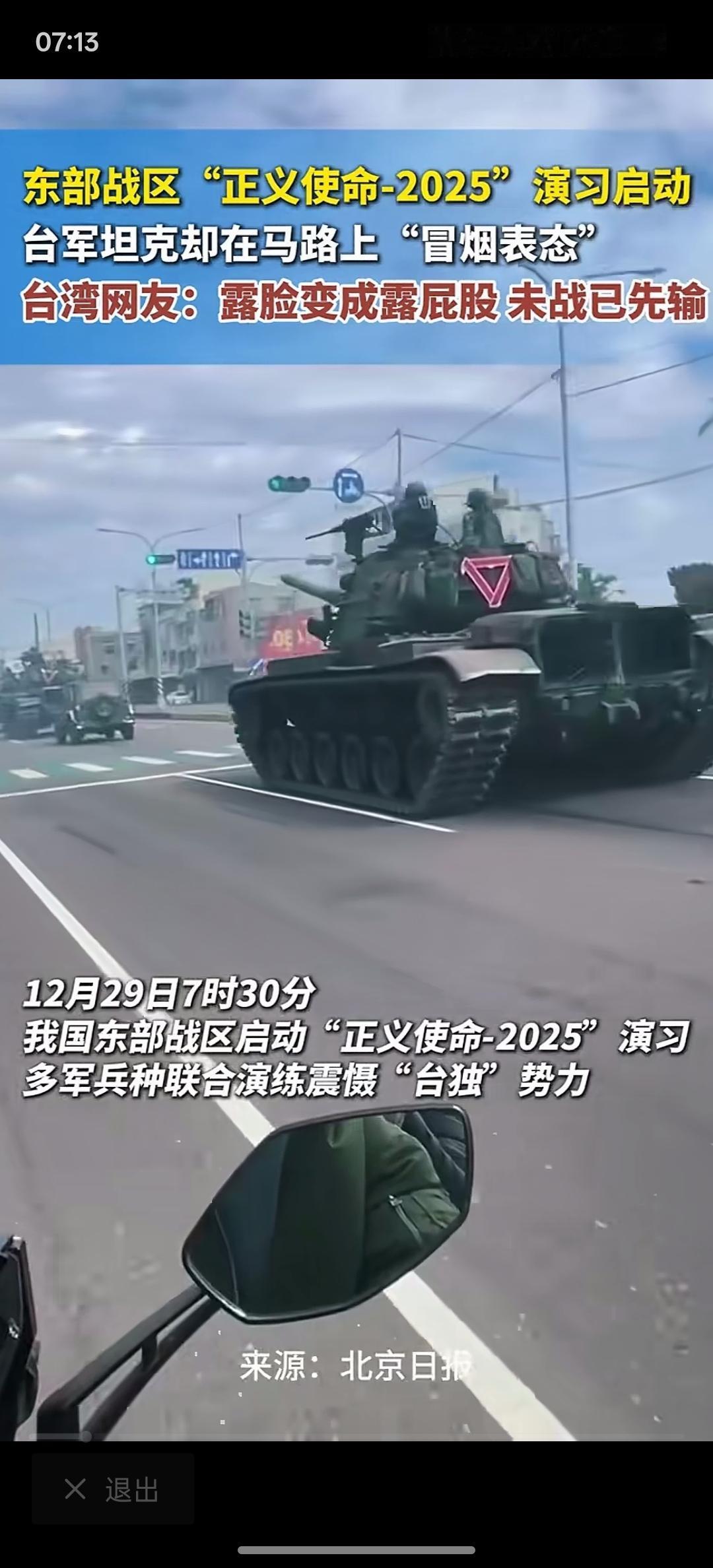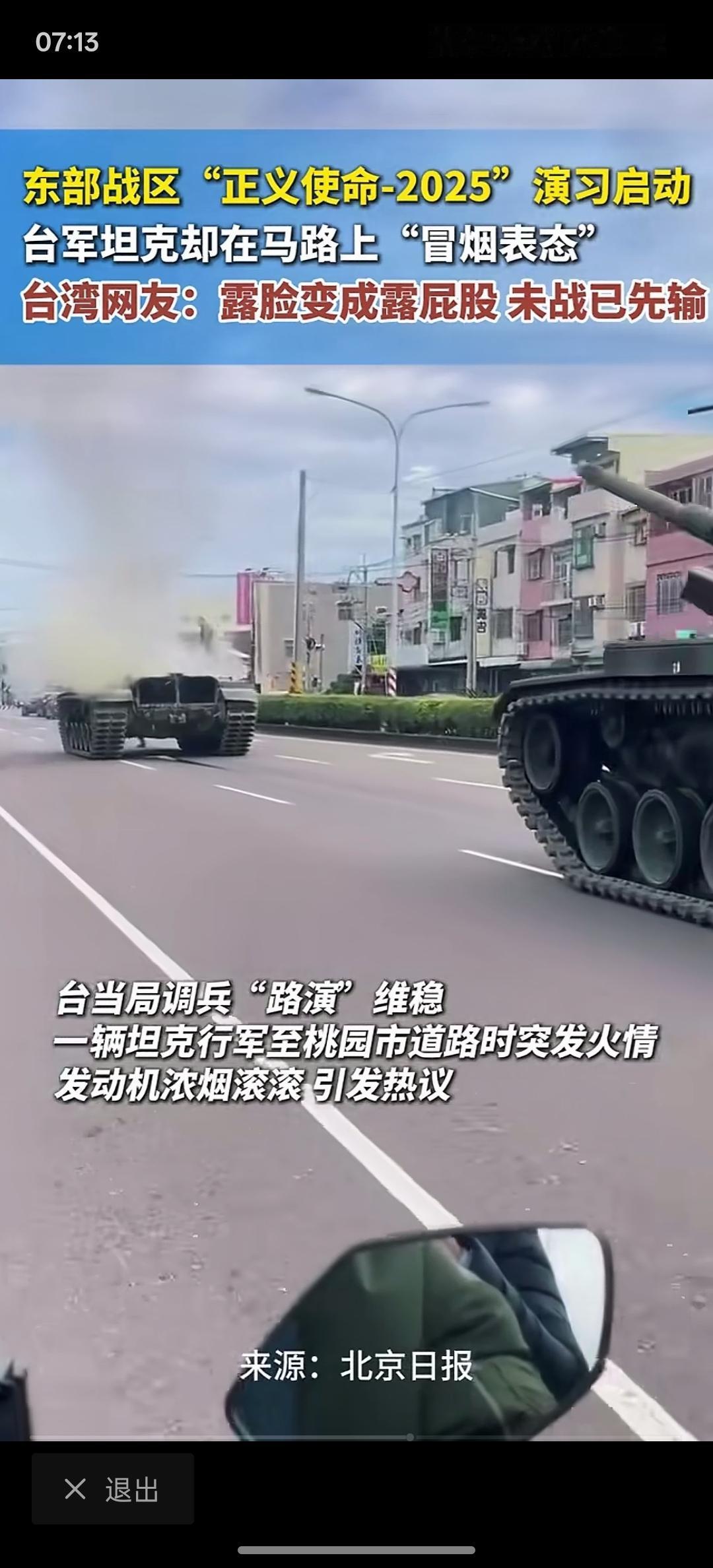 根据台湾当局这一次的应对,大陆军事演习在本土实行的抗议,台湾当局让这些坦克在公路上进行应对,结果发生了很让人感到尴尬的事情,就是这些坦克在马路上自己冒烟着火了,这叫做自己还为先打这个就嗝屁了!所以说台湾当局来应对中国大陆的军事行动以及军事演习,根本就无从应对!这些坦克在大街上都将成为活靶子!