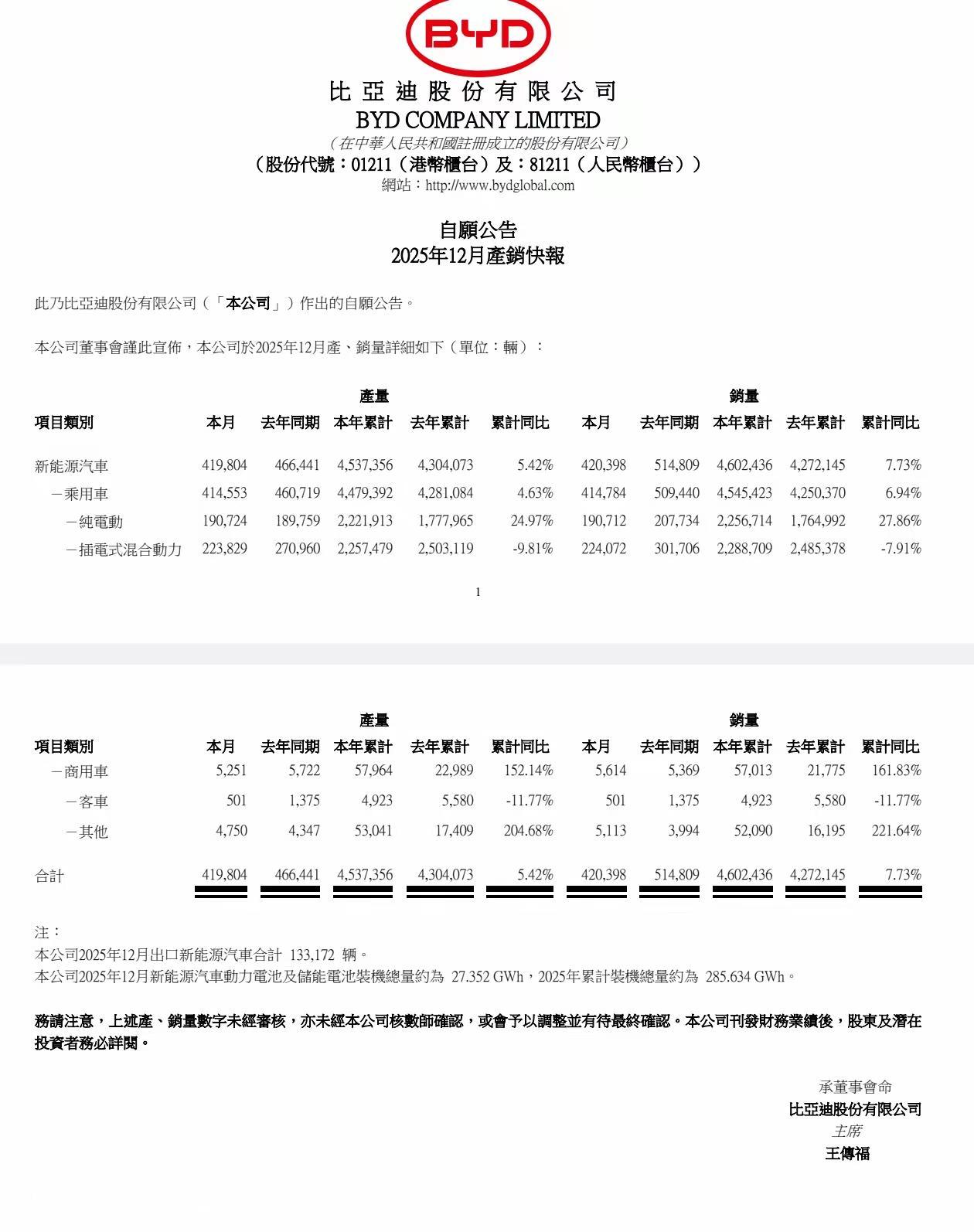刚刚,比亚迪发布了其2025年全年累计销量,突破460万辆,同比增长7.73%毫无悬念拿下自主车企销量第一。其中乘用车为454.5万辆,乘用车以及皮卡海外销量为104.9万辆,同比增长145%。 整体以及海外销量表现数据很漂亮,尤其海外销量完全进入自主品牌第一梯队,直接撼动奇瑞在出口方面的地位。 12月份销量超42万辆,虽然略低于市场预测50万辆左右的数据,但依然是巨无霸的存在了! 除开整车,比亚迪还有个关键数据很漂亮——动力电池装机量。根据公开数据统计,其2025 年累计装机总量为 285.634GWh。其12 月新能源汽车动力电池及储能电池装机总量约为 27.352GWh。【来自懂车帝车友圈】