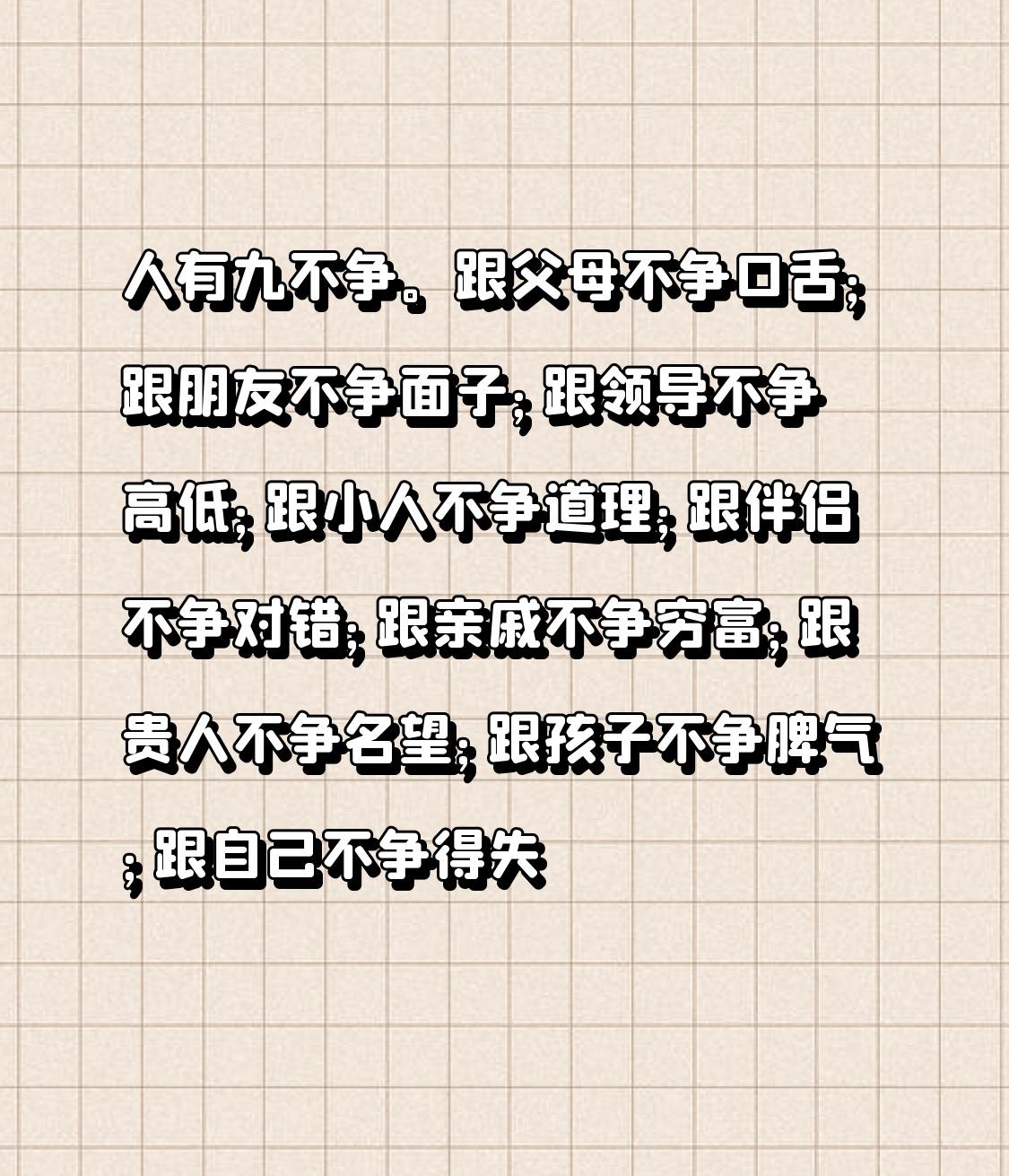 人有九不争之理。莫与父母争口舌长短;莫与朋友争面子虚荣;莫与领导争高低胜负;莫与小人争道理曲直;莫与伴侣争对错是非;莫与亲戚争穷富差别;莫与贵人争名望声誉;莫与孩子争脾气好坏;莫与自己争得失盈亏。