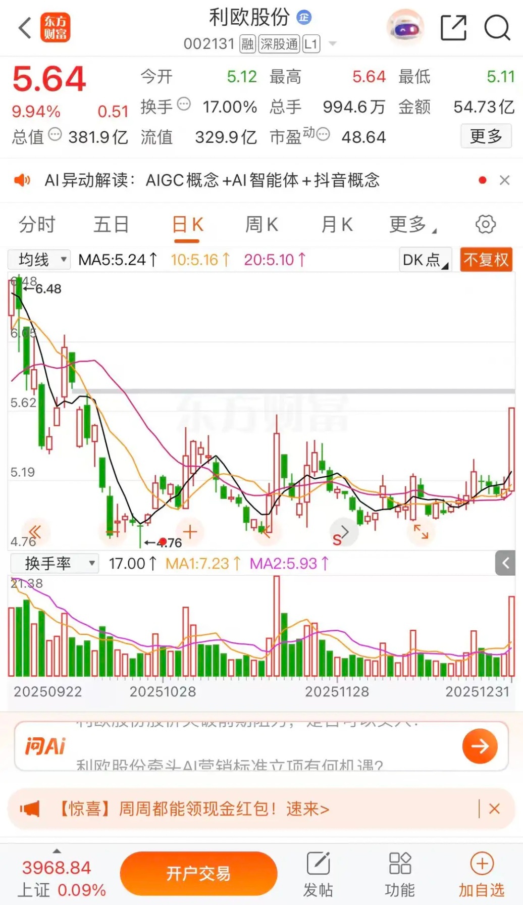 蓝色光标热榜第一节后冲高回落,利欧股份节后二板涨停蓝色光标涨停板收盘报收11.52元每股,成交金额111.6亿元,总市值达到413.6亿元。利欧股份涨停板收盘报收5.64元每股,成交金额54.73亿元,节后继续涨停板收盘报收6.20元每股。有望冲击近期高点6.85元每股。总市值达到381.9亿元。