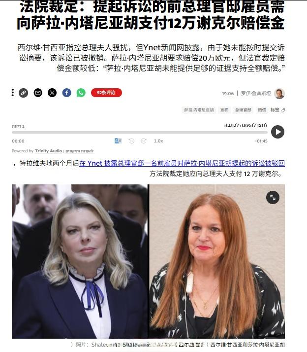 以色列法院对以色列总理官邸前服务员西尔维·甘西亚指控内塔尼亚胡的夫人萨拉对其实施骚扰一案作出判决,裁定西尔维为“诬告”,判处其向萨拉·内塔尼亚胡赔偿12万新谢克尔(两项指控各5万,律师费和诉讼费总共2万)。 这个官司打了六年,以色列法院一直批评西尔维·甘西亚多次没有按时出庭,却完全忽视内塔尼亚胡政权故意利用预备役征兵令让她无法出庭的背后因素。
