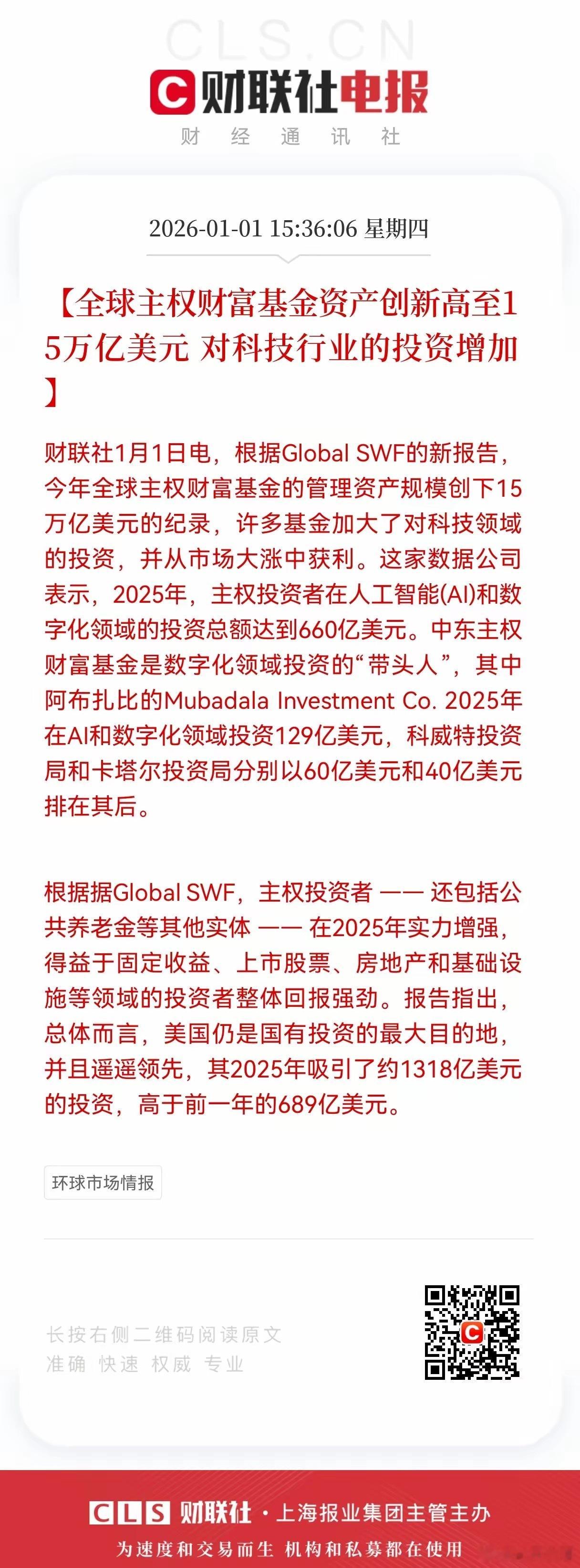 利好!大利好!全球主权财富基金规模破15万亿美元,科技投资成核心布局方向,节后大科技预计又要起飞了,又稳了!满仓大科技的股民们有福了。2026年伊始,Global SWF发布的最新报告抛出重磅数据:2025年全球主权财富基金管理资产规模一举突破15万亿美元大关,创下历史新高,而科技领域成为这批“国家钱袋子”加码布局的核心赛道。从投资流向来看,主权投资者在人工智能与数字化领域的动作尤为激进,2025年相关投资总额达到660亿美元,中东主权财富基金更是扛起了数字化投资的大旗。其中,阿布扎比的Mubadala Investment Co.表现最为亮眼,单家在AI和数字化领域的投资就达到129亿美元;科威特投资局、卡塔尔投资局则分别以60亿美元、40亿美元的投资额紧随其后,中东资本对科技赛道的押注力度可见一斑。主权财富基金规模的攀升,背后是多元投资领域的强劲回报支撑。Global SWF指出,包括公共养老金在内的主权投资者,2025年在固定收益、上市股票、房地产及基础设施等领域均收获了可观回报,这也让其资金实力进一步增强。在投资目的地的选择上,美国依旧是主权资本的“头号选择”,2025年吸引了约1318亿美元的国有投资,较前一年的689亿美元近乎翻倍,凸显出美国市场对全球主权资本的持续吸引力。整体而言,主权财富基金规模的扩容与投资结构的转向,既反映出全球资本对科技赛道长期价值的认可,也体现了主权投资者在资产配置上的多元化与前瞻性,未来科技领域尤其是AI、数字化方向,仍将是主权财富基金的重点布局领域