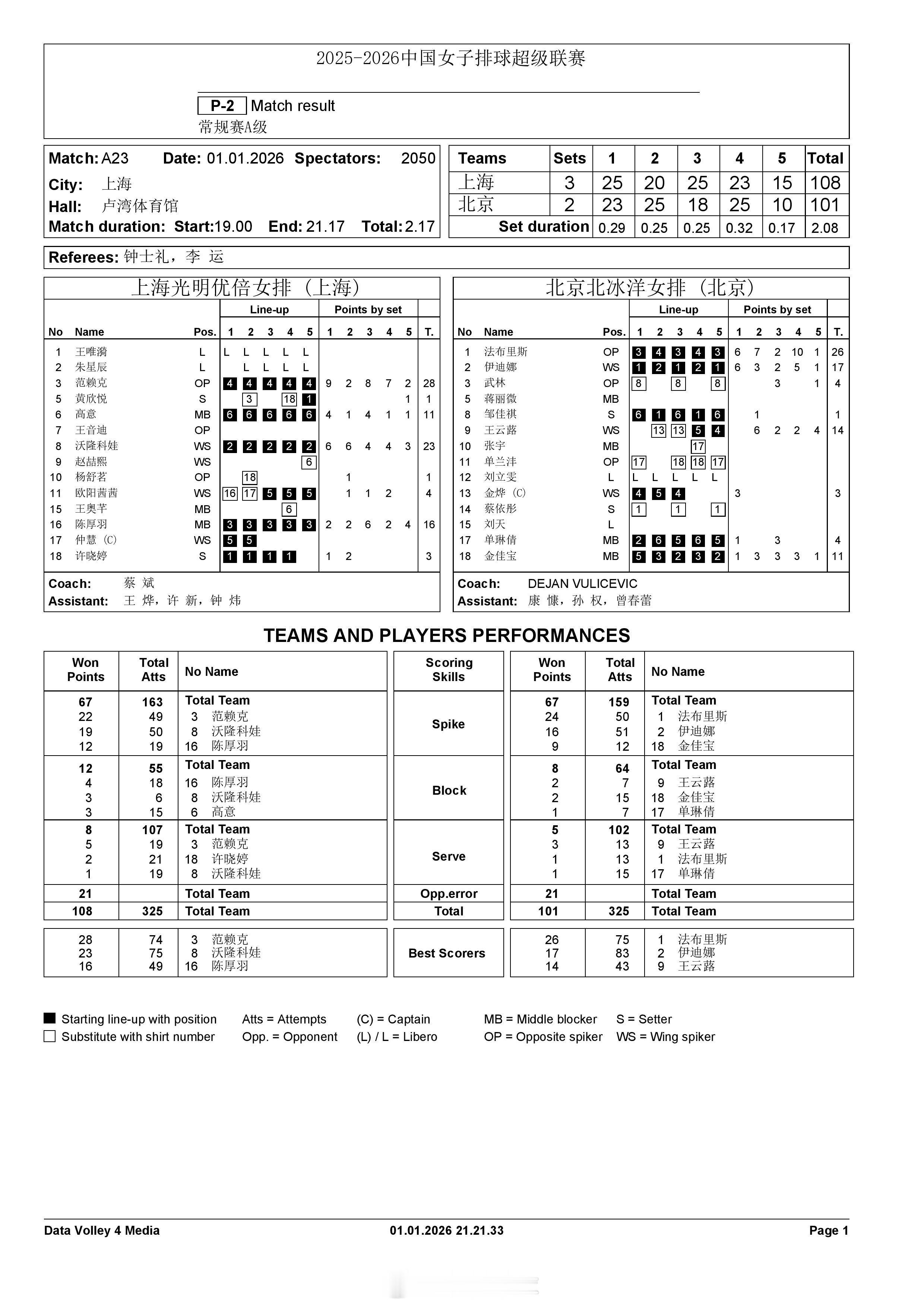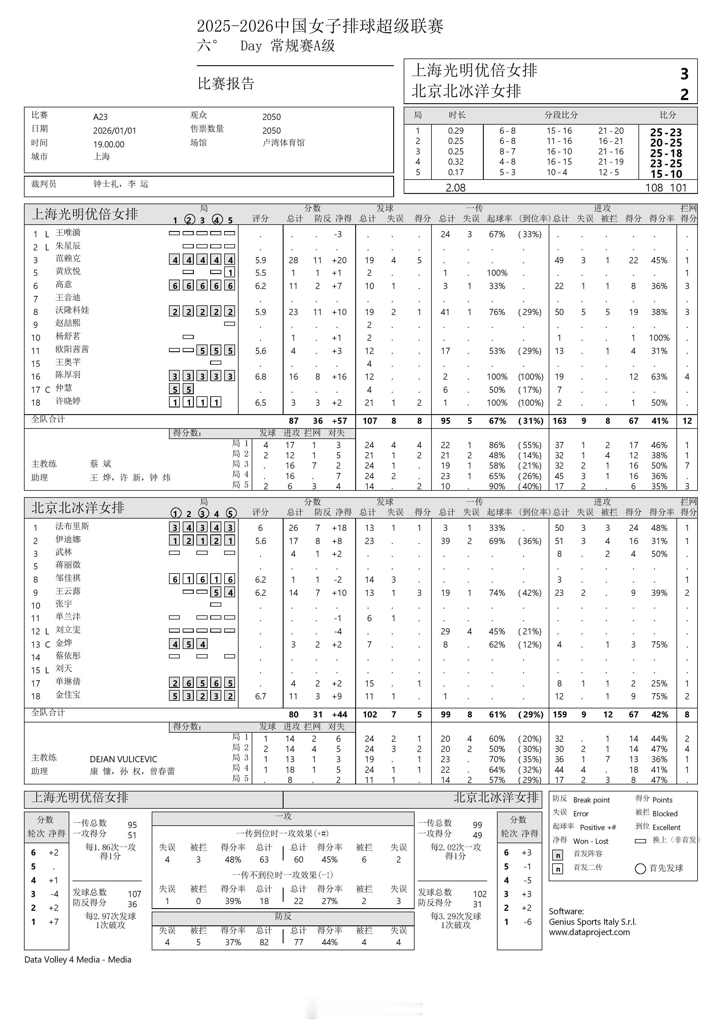 【中国女排超级联赛 上海3-2北京得分统计】1月1日晚,A级常规赛第6轮,上海光明优倍在主场以3-2(25-23, 20-25, 25-18, 23-25, 15-10)战胜北京北冰洋。范赖克28分(49扣22中、拦1发5),沃伦科娃23分(50扣19中、拦3发1),陈厚羽16分(19扣12中、拦4),高意11分(22扣8中、拦3);法布里斯26分(50扣24中、拦1发1),伊迪娜17分(51扣16中、拦1),王芸蕗14分(23扣9中、拦2发3),金佳宝11分(12扣9中、拦2)。扣球67-67、拦网12-8、发球8-5、对手失误21-21。