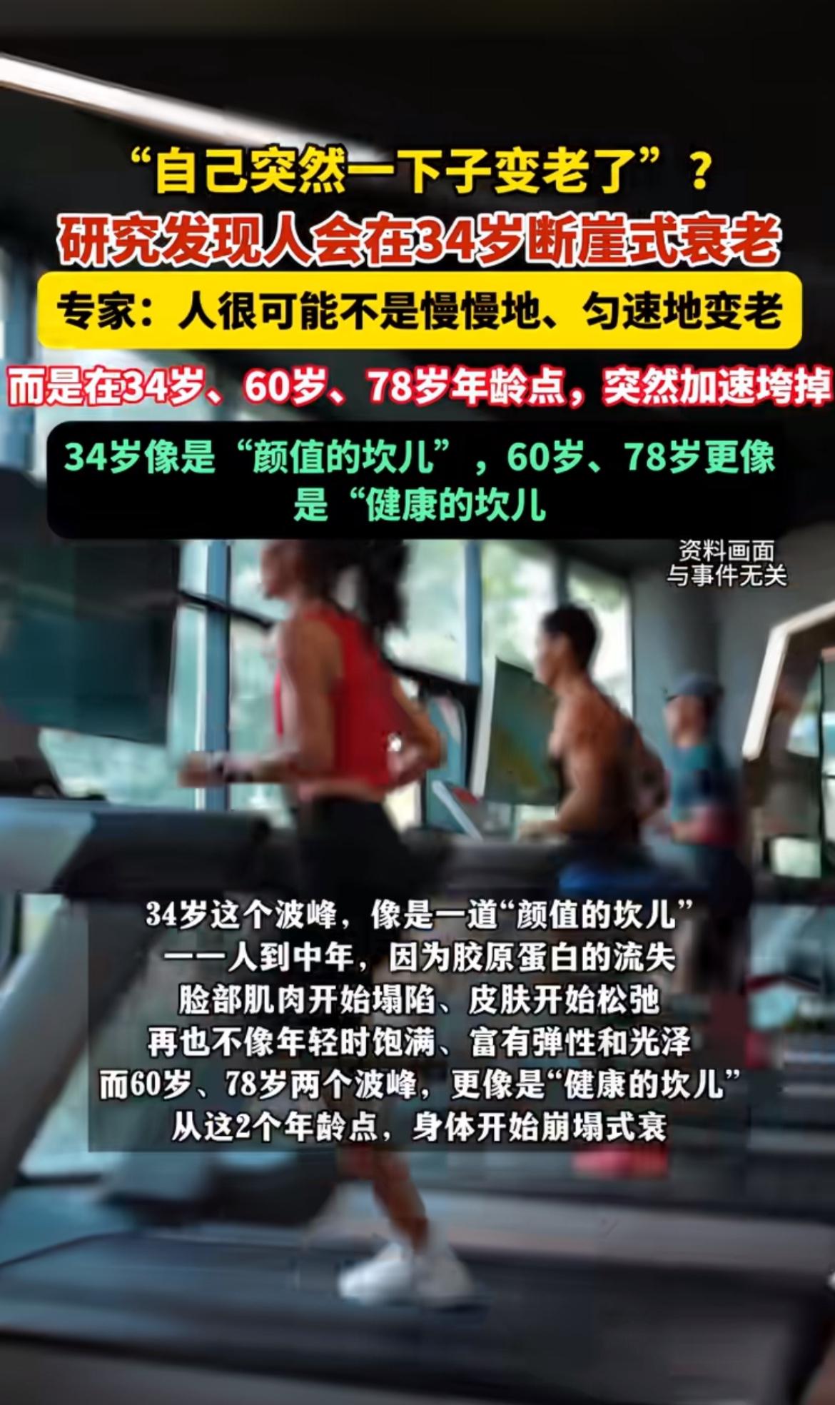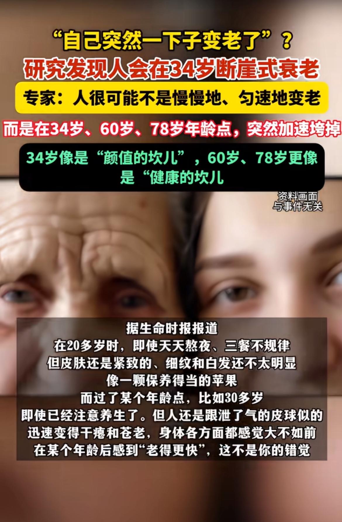 34岁断崖式衰老真不是开玩笑!斯坦福大学研究表明,人体衰老不是匀速的,34岁、60岁、78岁是加速节点,34岁是首个明显转折点。分析4263人的血浆样本发现,34岁后1379种衰老相关蛋白质剧烈波动,胶原蛋白合成骤降40%,皮肤松弛、法令纹加重。代谢也下降10%-15%,熬夜难恢复,腹部易长肉。 这年龄阶段事业和家庭压力大,不良生活习惯加剧机能下滑。不过别慌,每周3次中等强度运动、健康饮食、做好防晒和规律作息能延缓衰老。34岁是健康提醒,不是衰老终点。