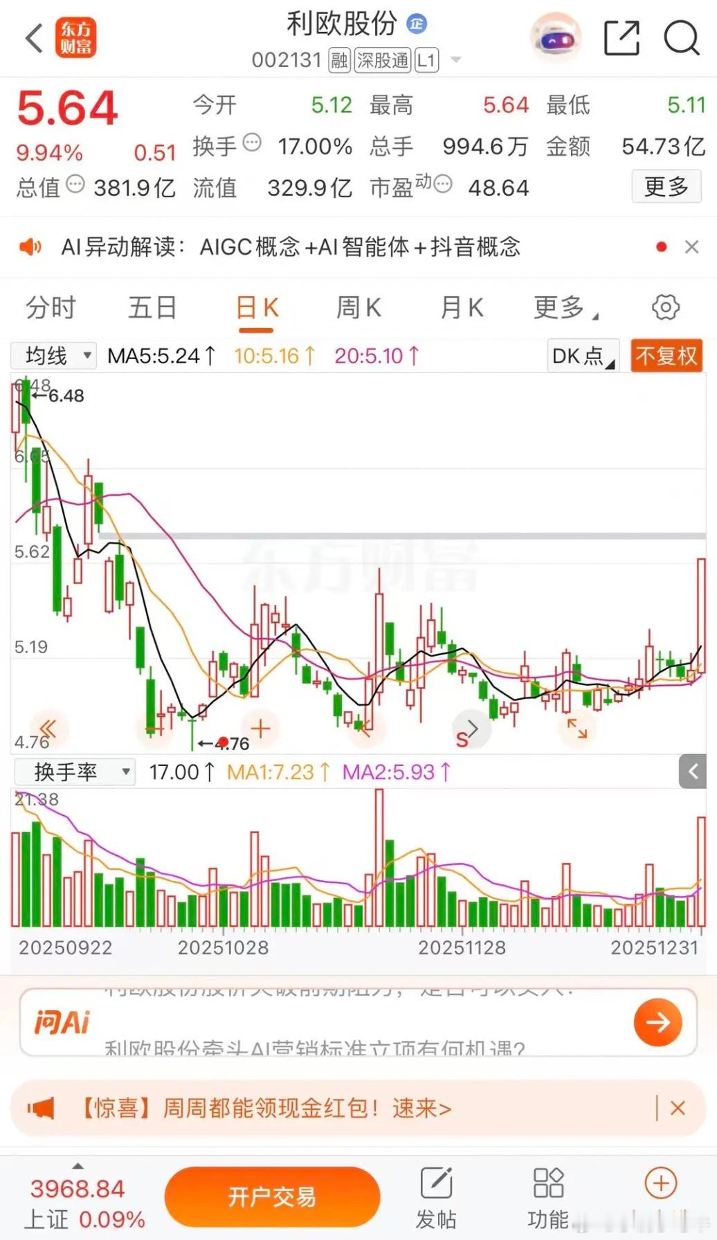 蓝色光标热榜第一节后冲高回落,利欧股份节后二板涨停蓝色光标涨停板收盘报收11.52元每股,成交金额111.6亿元,总市值达到413.6亿元。利欧股份涨停板收盘报收5.64元每股,成交金额54.73亿元,节后继续涨停板收盘报收6.20元每股。有望冲击近期高点6.85元每股。总市值达到381.9亿元。