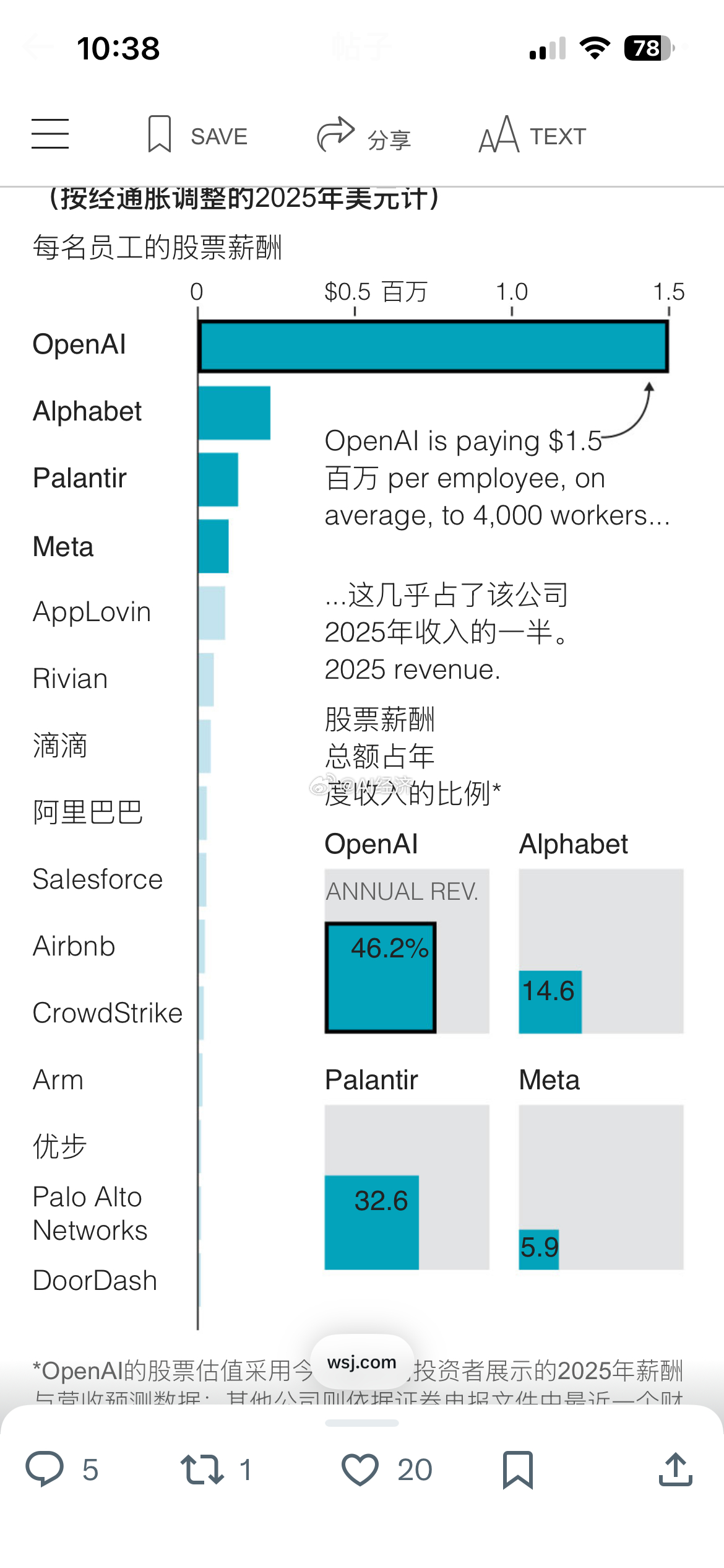 OpenAI给员工的薪酬超过历来所有大型科技初创企业2025年,OpenAI员工的人均股票薪酬约为150万美元,大约是其他18家大型科技公司上市前一年平均员工薪酬的34倍