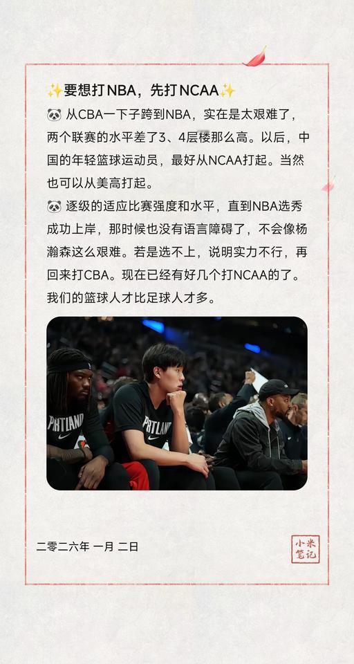 🐼 从CBA一下子跨到NBA,实在是太艰难了,两个联赛的水平差了3、4层楼那么高。以后,中国的年轻篮球运动员,最好从NCAA打起。当然也可以从美高打起。 🐼 逐级的适应比赛强度和水平,直到NBA选秀成功上岸,那时候也没有语言障碍了,不会像杨瀚森这么艰难。若是选不上,说明实力不行,再回来打CBA。现在已经有好几个打NCAA的了。我们的篮球人才比足球人才多。 🐼 优秀的苗子,在国内打球容易混成平庸。只要一个人在外边闯荡,闯出名堂了,才是一条龙。我们的集体体育项目成绩不行,个人的项目很强,那就要把球员送到海外联赛,让他去单独打拼。 作者:龙须面🧐