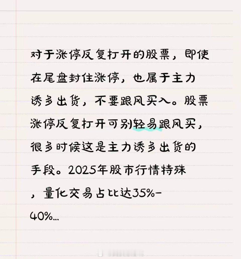 对于涨停反复打开的股票,即使在尾盘封住涨停,也属于主力诱多出货,不要跟风买入。股票涨停反复打开可别轻易跟风买,很多时候这是主力诱多出货的手段。2025年股市行情特殊,量化交易占比达35%-40%以上,主力藏在算法后搞操作,套路多多。10月头两周,A股超50只个股出现涨停反复开板的“烂板”走势,有人追进去3天亏15%。不过也不能一棍子打死,涨停反复打开也可能是洗盘、出货、分歧三种情况的表现。低换手5%以下开板基本是洗盘,如9月30日华建集团涨停开板3次,全天换手率才1.61% ,后续重新封板概率超70%。