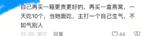 自己再买一箱更贵更好的,再买一盒燕窝,一天吃10个,当她面吃,主打一个自己生气,不如气别人
