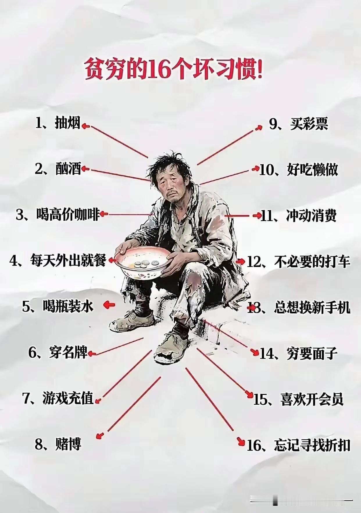 竟然占了12条!原来是这么穷的?看来不改变自己,不改变平日里的一些坏习惯,想富起来,门都没有! 不知你有没有这些坏习惯?有的话,说说占了几条? 有个成语说得好“穷则思变”,不改变就只能一直穷下去!大家说呢?