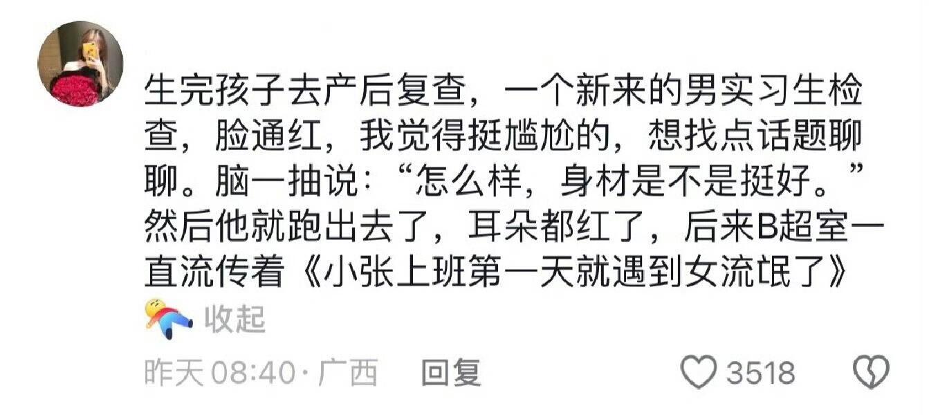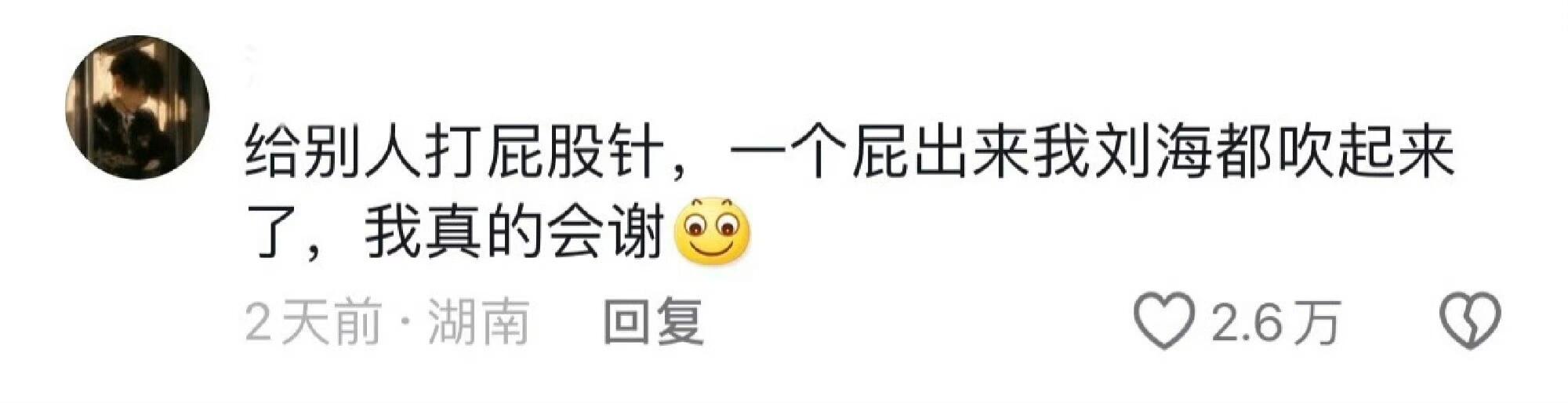 给别人打屁股针,一个屁出来我刘海都吹起来了,我真的会谢