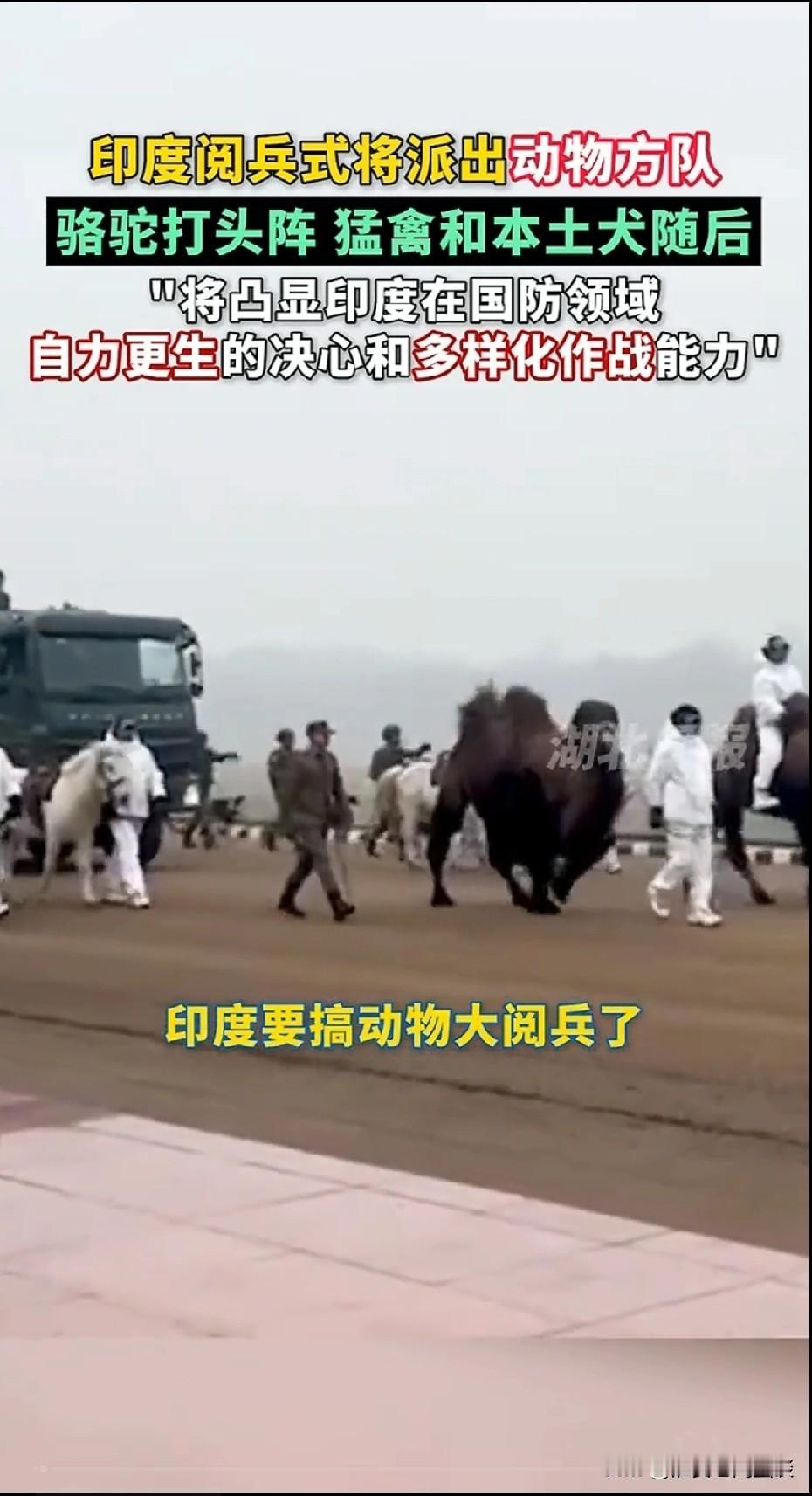 印度阅兵式将首次出现动物方队!印度阅兵又整新活!2026年1月的阅兵式将首次出现动物方队。据报道,这方队由2匹双峰骆驼打头,后面跟着4匹山地矮种马、4只猛禽、10只印度本土犬和6只常规军犬。 有人调侃是摩托车玩腻了才上动物。其实这可不只是“萌宠走秀”,从国防战略和文化表达来看,每一步安排都有深意。打头的双峰骆驼是“沙漠后勤兵”,适合西北部沙漠地形;山地矮种马则对应北部喜马拉雅山区。不得不说,印度这次把动物在军事中的作用展示得明明白白。