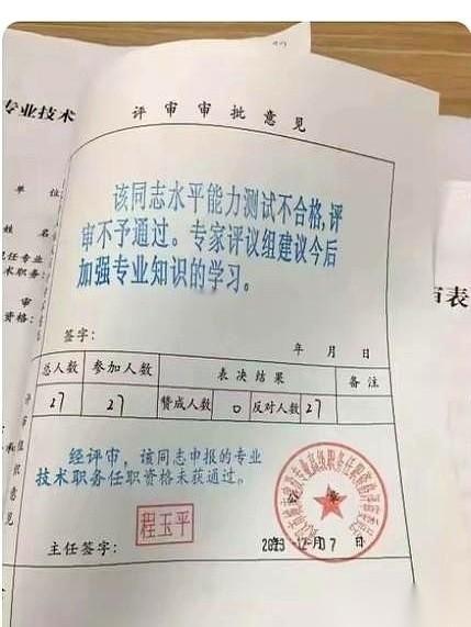 27个评委,0票赞成,27票反对。 我今天看到这张职称评审结果,后背都凉了。以前