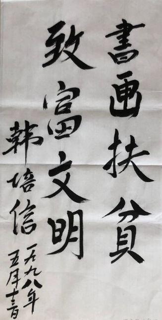 韩培信的两幅书法作品赏析,第一幅《腾飞》单字幅,是2009年2月12创作的,“腾飞”二字笔墨酣畅淋漓,笔画粗细对比强烈,“腾”字结构开张,笔势上扬,“飞”字的最后一笔竖画劲健洒脱,如长剑破空。 第二幅作品《书画扶贫 致富文明》,创作于1998年5月13日,这副作品,字体以行书为主,笔画沉稳厚重,“书画扶贫”四字落笔扎实,“致富文明”则笔意稍缓,字间布局均匀,没有花哨的技巧,却显朴实端正。 韩培信是从革命岁月里走出来的老干部,他肚里藏着不少墨水,博学得很。他工作能力出众,还擅长书法,笔下笔墨透着岁月厚重,令人佩服。