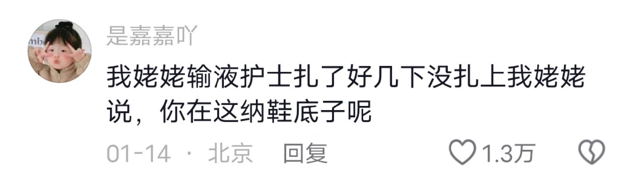 我姥姥输液,护士扎了好几下没扎上,我姥姥说,你在这纳鞋底子呢