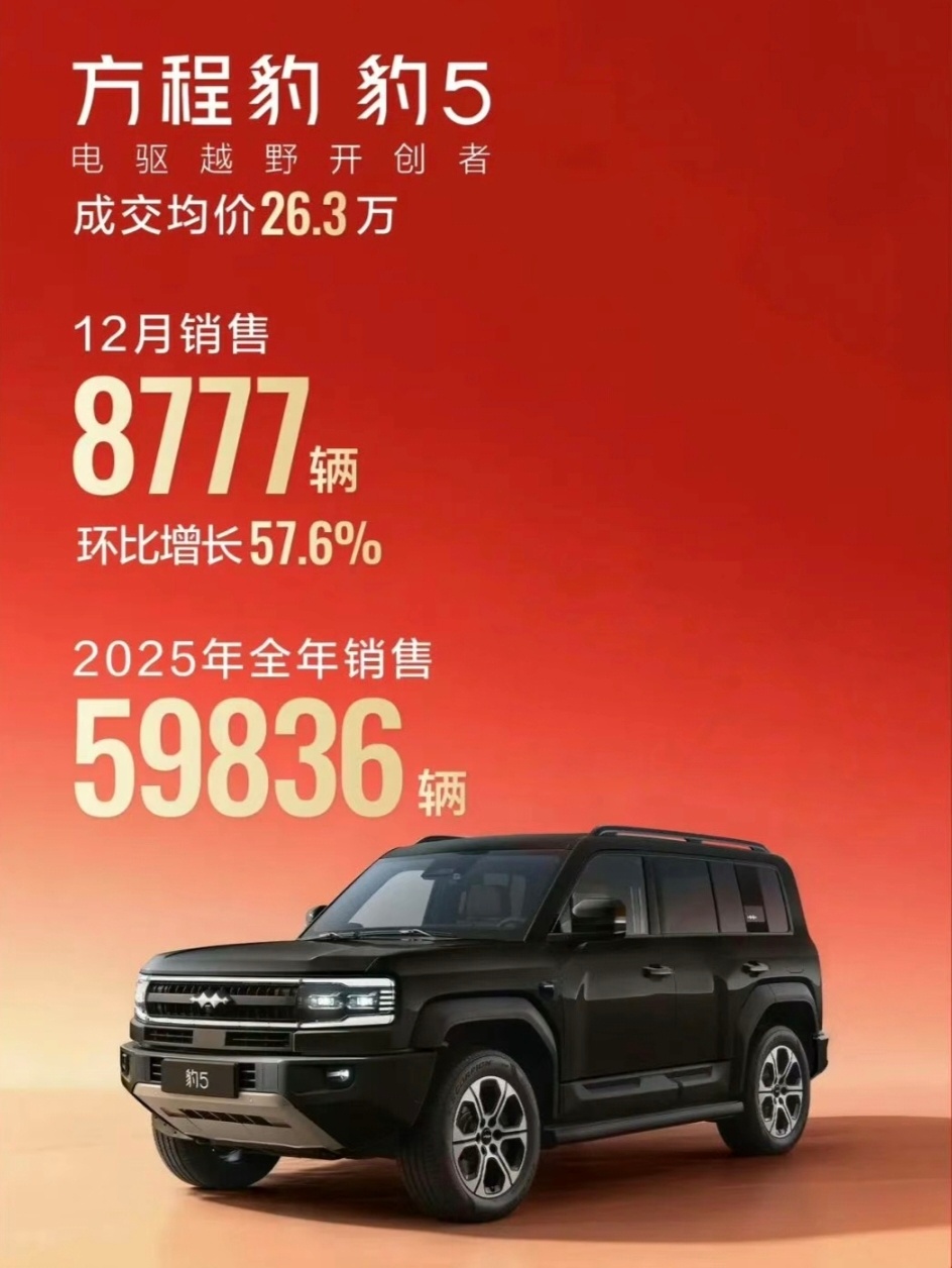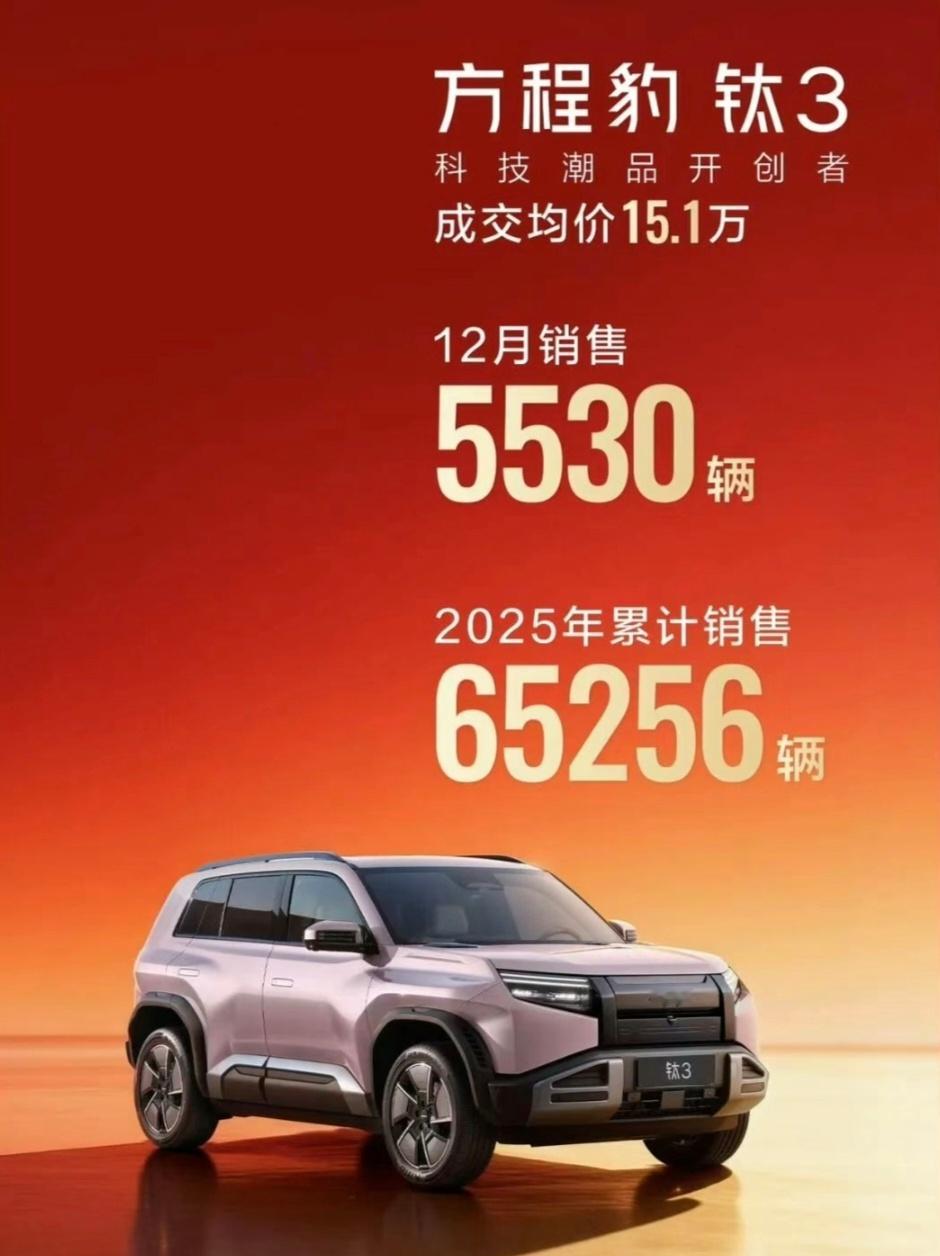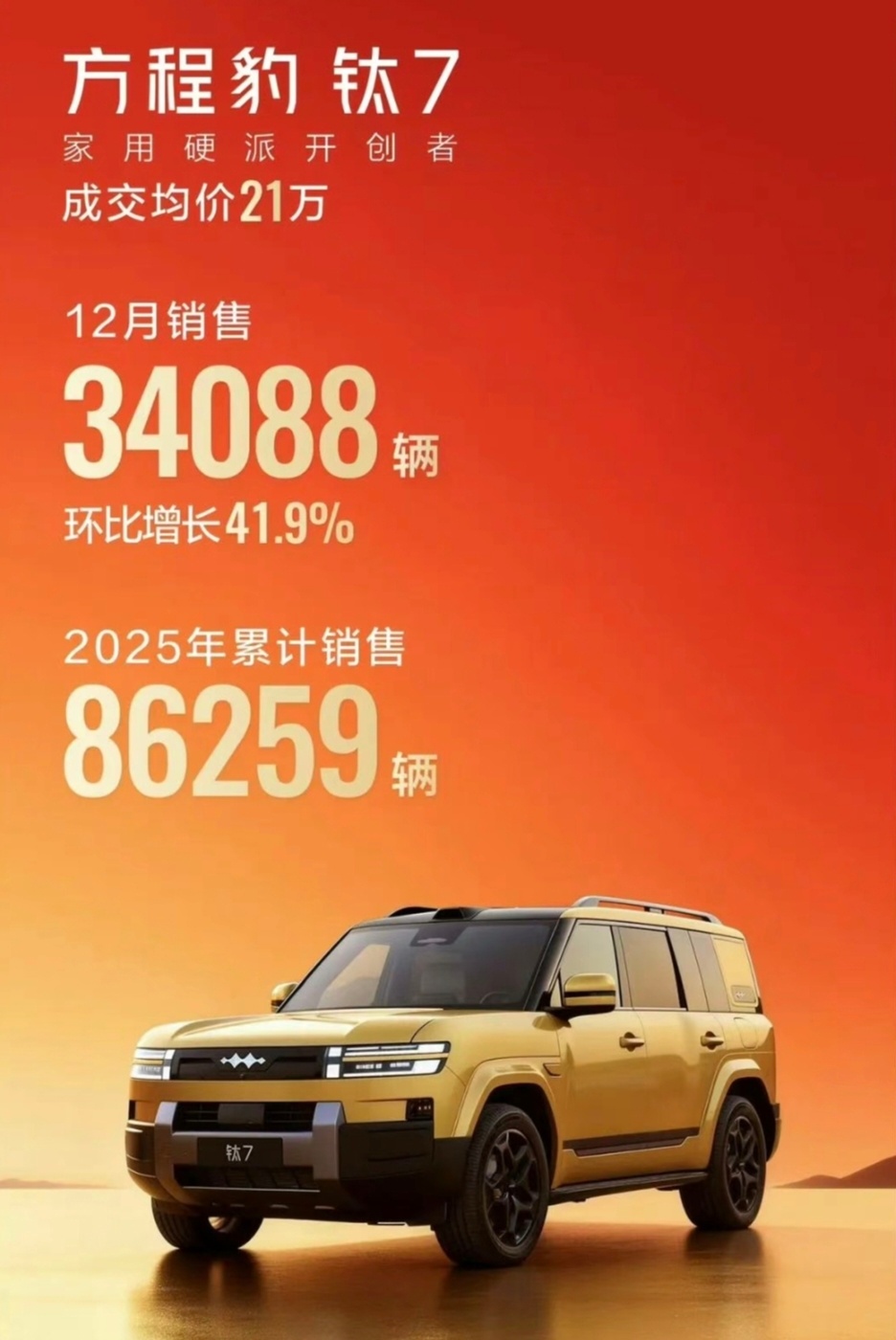 牛掰克拉斯!说的是钛7 12月份销量,牛叉哄哄的一个月3.4万台!11月份2.4万台12月份3.4万台,并且带动了钛3、豹5豹8的销量!很可能,小米YU7连续4个月中大型SUV销量冠军的头衔,已经被钛7取而代之!百家车坛我的方程豹真聪明