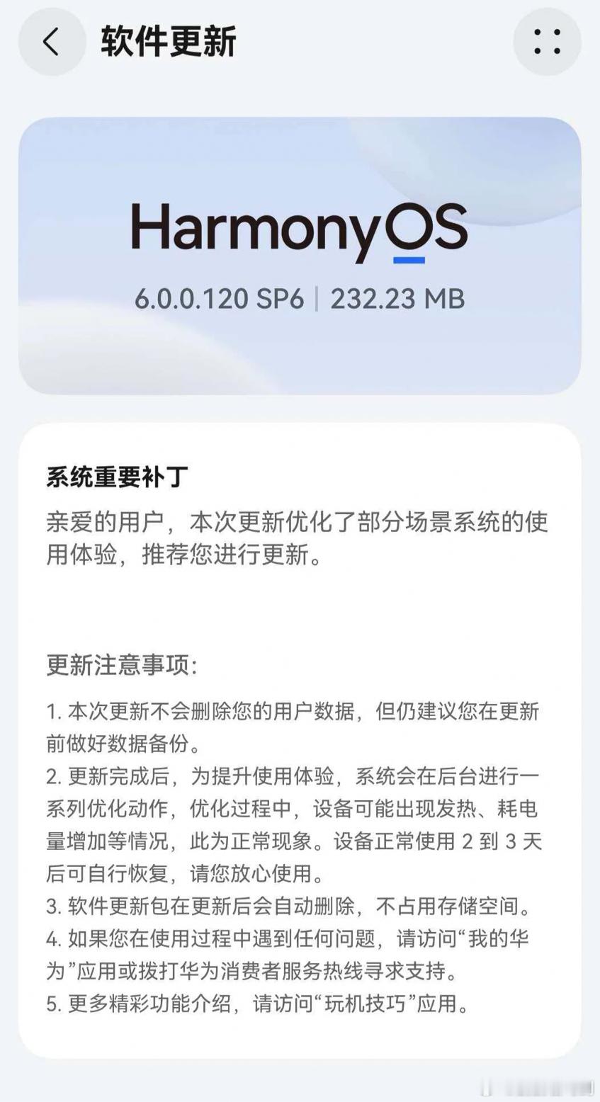 华为手机元旦闹钟响铃问题已经修复了~这两天有小伙伴反馈说自己元旦早晨被闹钟吵醒,刚发现手机推送了一个新版本,赶紧下载更新了一下,发现问题已经解决了。另外更新重启后再手动开关一次闹钟,这样更保险!大家赶快都升级一下吧~另外还停留在鸿蒙5的小伙伴,尽快升级到鸿蒙6吧,体验绝对会更好。鸿蒙越用越香华为可靠的Mate