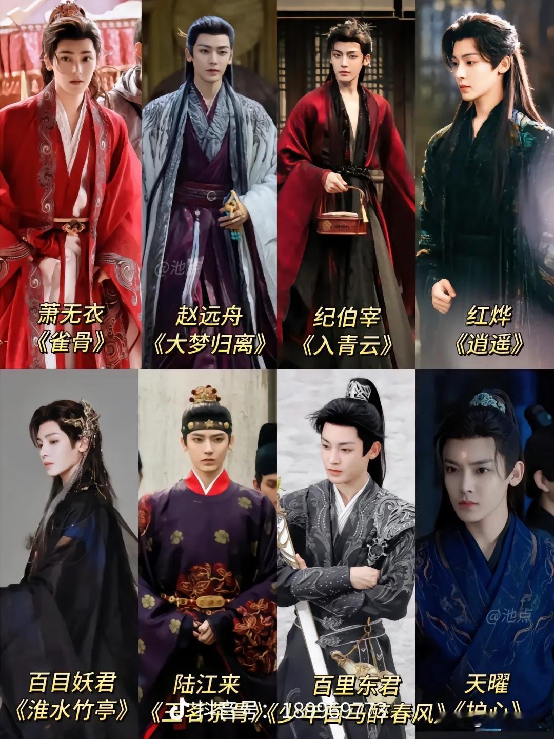 上排角色 1. 萧无衣:《雀骨》中背负弑君污名的靖安王世子,性格腹黑且外冷内热。 ​ 2. 赵远舟:《大梦归离》中的核心角色,是侯明昊的代表性古装角色之一。 ​ 3. 纪伯宰:《入青云》里表面浪荡、实则隐藏身份的下毒者,与女主上演双强博弈。 ​ 4. 红烨:《逍遥》中的角色,造型以深色系古装为主,气质冷峻。 下排角色 1. 百目妖君:《淮水竹亭》中的南垂蜘蛛妖王,凶狠残暴却对爱人情深意重。 ​ 2. 陆江来:《玉茗茶骨》中的状元郎,遭人陷害后失忆,与茶王之女展开探案与情感线。 ​ 3. 百里东君:《少年白马醉春风》的镇西侯府小公子,从嗜酒少年成长为江湖英雄。 ​ 4. 天曜:《护心》中的灵龙,前期天真软萌,后期沉稳霸气,是侯明昊的经典古装角色。