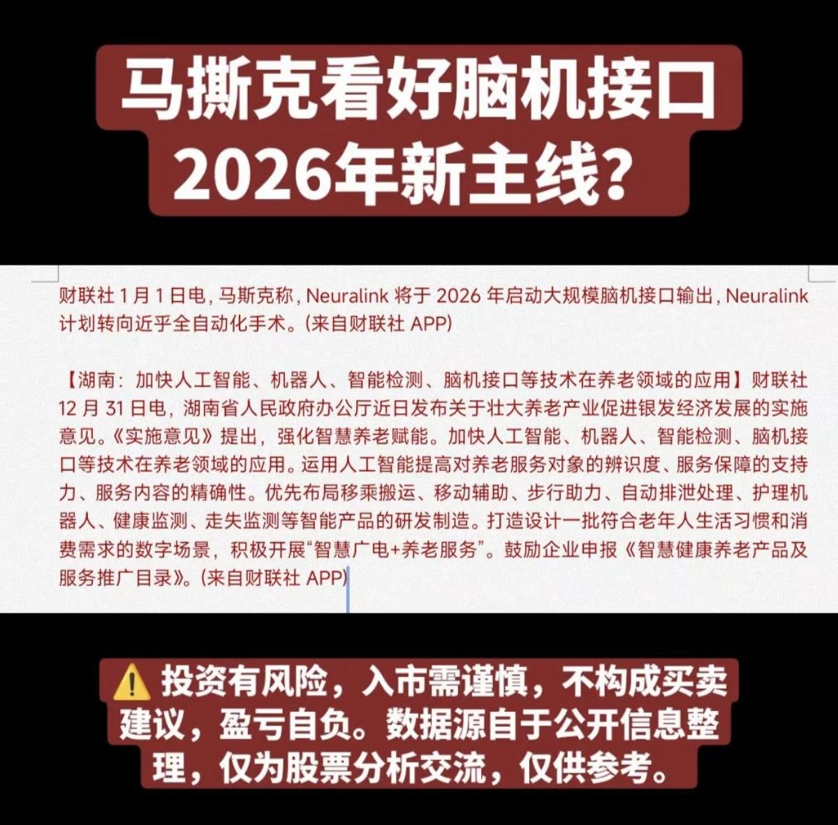 马斯克:看好脑机接口,2026年新主线? 2026年1月1日,马斯克声称,将于2026年启动大规模脑机接口出口,另外,湖南也发文加快脑机接口应用。 相关脑机接口核心龙头股: